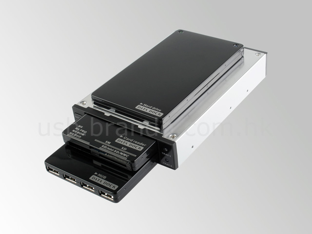 USB 2.5 SATA HDD + USB 4-Port Hub + USB Card Reader External Enclosure This 3-in-1 Data Tray Docking comes with THREE different 2.5 external enclosures of HDD/USB HUB/Card Reader. It allows you to plug any two 2.5 external encolsures for the usage. Moreove