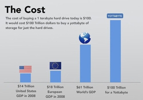 A yottabyte is one septillion bytes. To save all those bytes you need a data center as big as the states of Delaware and Rhode Island. It doesn't seem like much, until they tell you the price tag: $100 trillion.