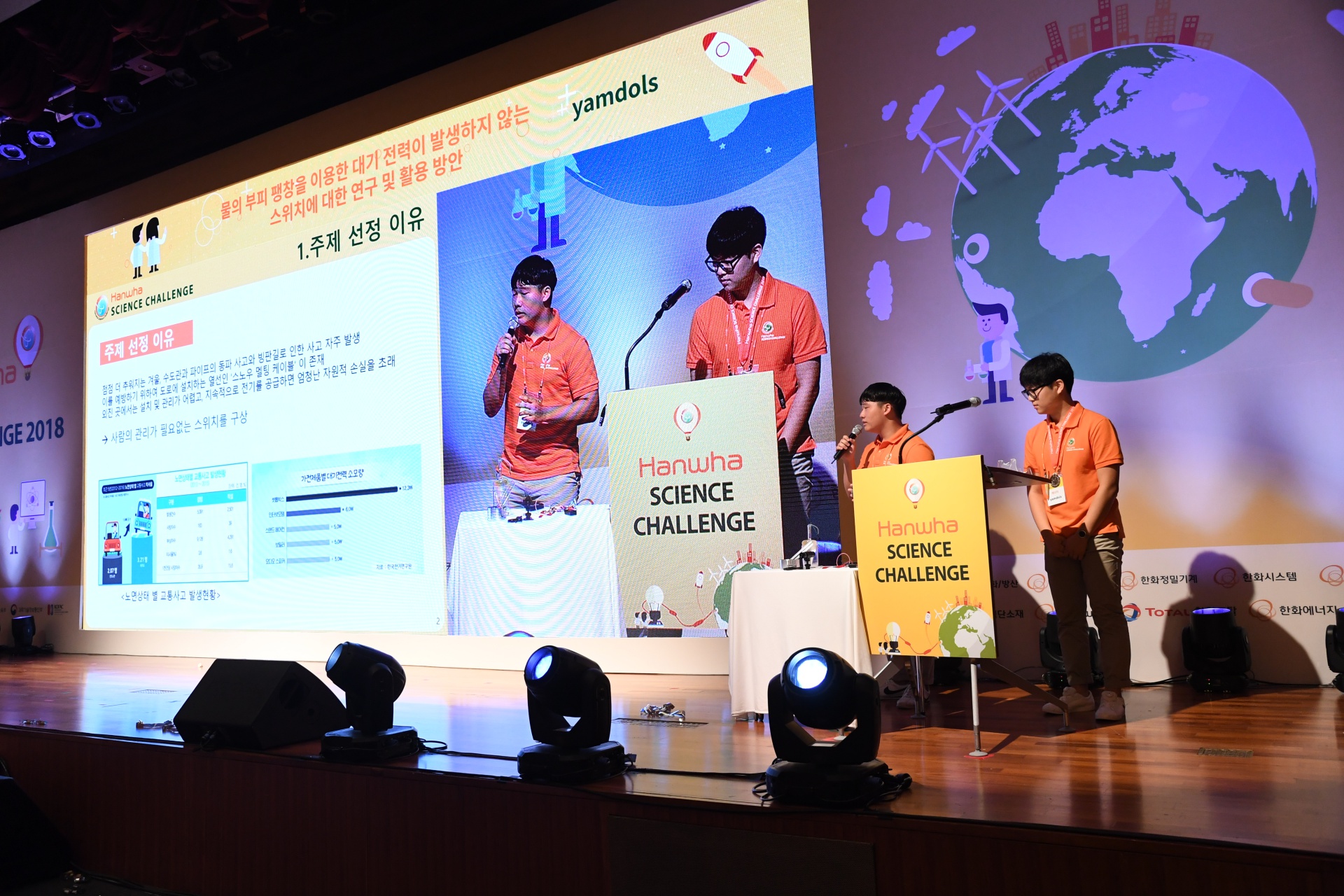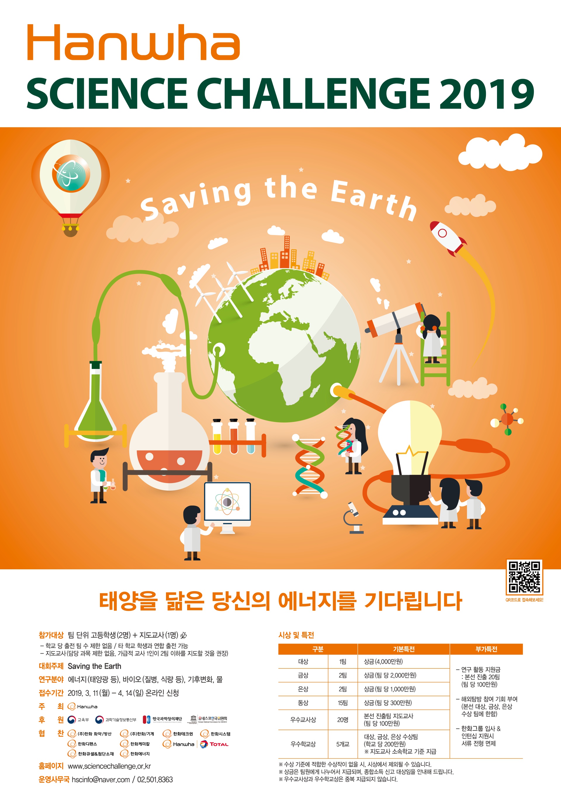 ์ง๊ตฌ๋ฅผ ์ง์ผ๋ผ(Save the earth). ์ง๋ 2011๋ ๋ถํฐ ๋งค๋ ์ด๋ฆฌ๊ณ ์๋ ์ฒญ์๋ ๊ณผํ๊ฒฝ์ง๋ํ ํํ์ฌ์ด์ธ์ค์ฑ๋ฆฐ์ง(Hanwha Science Challenge)๊ฐ ์ด์ด๊ฐ๊ณ ์๋ ๋์ฃผ์ ์ด์ ๋น์ ์ธ๋ฐ์. ๋งค๋ 1,000์ฌ๋ช ์ด ๋๋ ๊ณผํ ์์ฌ๋ค์ด ์ฐธ์ฌํด ๊ณผํ๊ณผ ํกํก ํ๋ ์์ด๋์ด๋ฅผ ๊ฒฐํฉํด ํฅ๋ฏธ๋ก์ด ์๋ฃจ์ ์ ๋ด๋์ผ๋ฉฐ ๊ทธ ํด๋ฒ ์ฐพ๊ธฐ์ ๋์๊ณ ์์ต๋๋ค.
