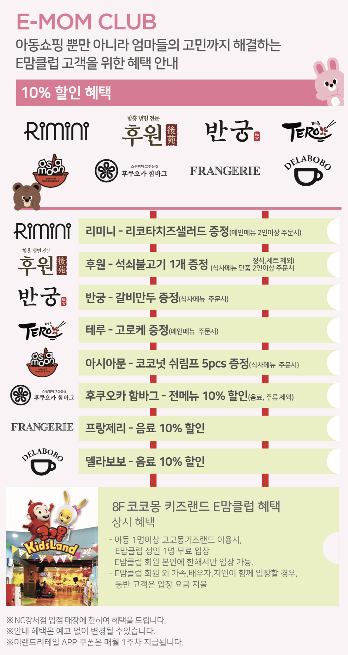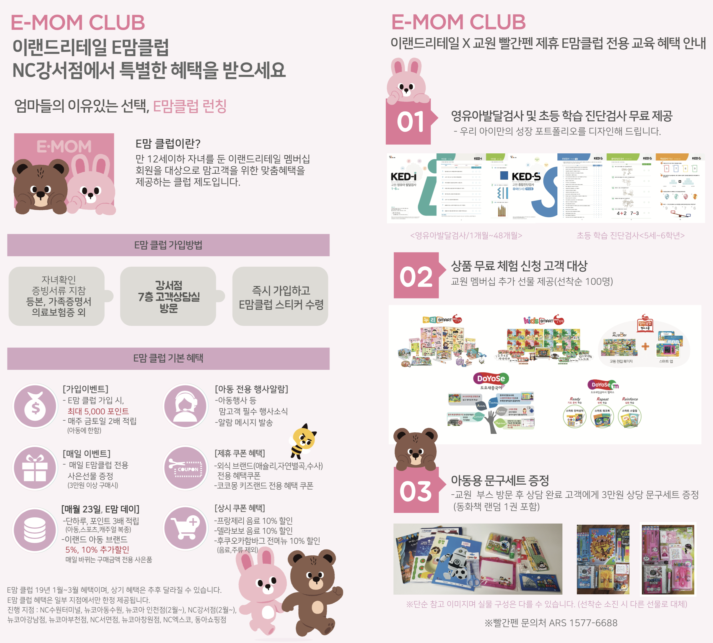 μΌμμλ Eλ§ ν΄λ½(E-MOM CLUB)μ΄λΌλ μΆκ° λ©€λ²μ νλ‘κ·Έλ¨μ μ΄μνκΈ° μμνλ 보λλΌκ³ μ. Eλ§ ν΄λ½μ κ·Έ μ΄λ¦μμ μ μΆν μ μλ κ²μ²λΌ λ§ 12μΈ μ΄νμ μλ