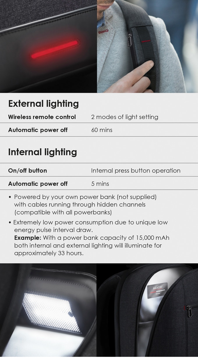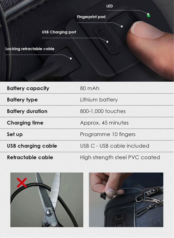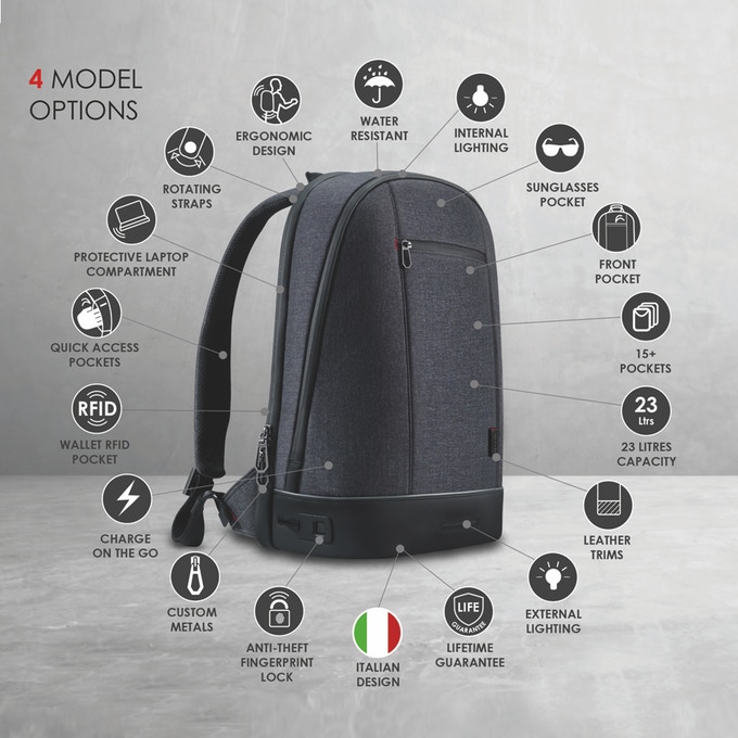 Anti-theft fingerprint lock + Internal/External lights + Charge on-the-go + 30 amazing features + Italian design + Lifetime guarantee