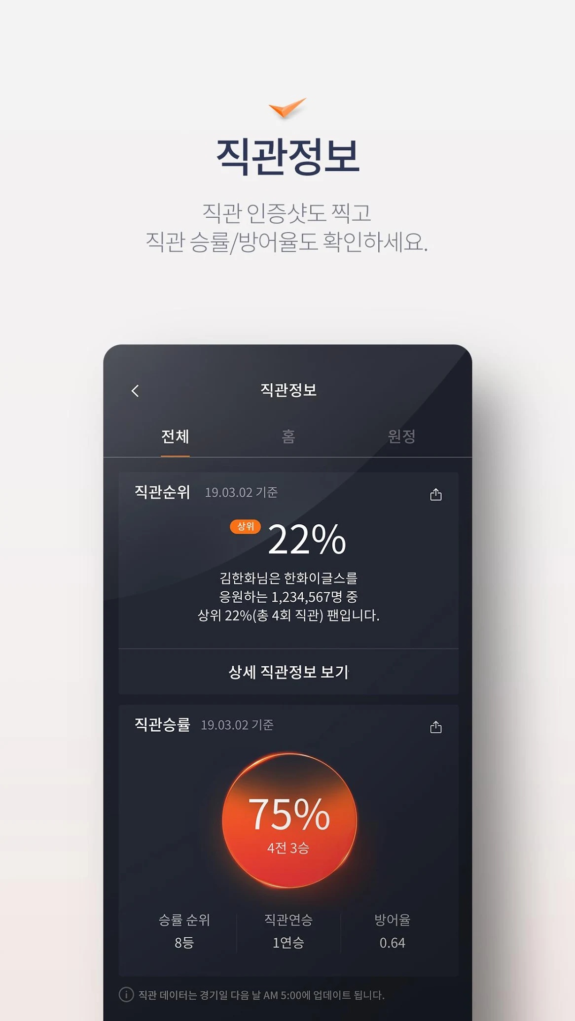 Bring It! No Matter What ν•œν™”μ΄κΈ€μŠ€μ˜ 곡식 λͺ¨λ°”일 앱이 ν•œν™”μ΄κΈ€μ½•μœΌλ‘œ μƒˆλ‘­κ²Œ νƒœμ–΄λ‚©λ‹ˆλ‹€! μ΅œκ°•ν•œν™”, λΆˆκ½ƒ μ΄κΈ€μŠ€μ˜ 도약에 μ—¬λŸ¬λΆ„μ„ μ΄ˆλŒ€ν•©λ‹ˆλ‹€.   [응원λͺ¨λ“œ] ν•œν™”μ΄κΈ€μŠ€λ§Œμ˜ μœ‘μ„±μ‘μ›μ„ μ—…κ·Έλ ˆμ΄λ“œν•˜λΌ! ν•œν™”μ΄κΈ€μ½•μ˜ 응원λͺ¨λ“œλŠ” μ£Όλ³€μ˜ μŒμ„±μ„ μΈμ‹ν•˜μ—¬ μ˜€λ Œμ§€ 빛을 λ°œμ‚°ν•©λ‹ˆλ‹€. λͺ¨λ‘ ν•¨κ»˜ κ²½κΈ°μž₯을 μ˜€λ Œμ§€ λΉ›μœΌλ‘œ λ¬Όλ“€μ—¬ λ³΄μ•„μš”!   [λ‚˜μ˜ 직관 정보 & μ§κ΄€ 인증] GPS기반으둜 κ²½κΈ°μž₯ λ°©λ¬Έ μ‹œ 체크인 κ°€λŠ₯ν•˜λ©°, μ§κ΄€ μ‹œ 승패λ₯Ό κ³„μ‚°ν•˜μ—¬ λ‚˜μ˜