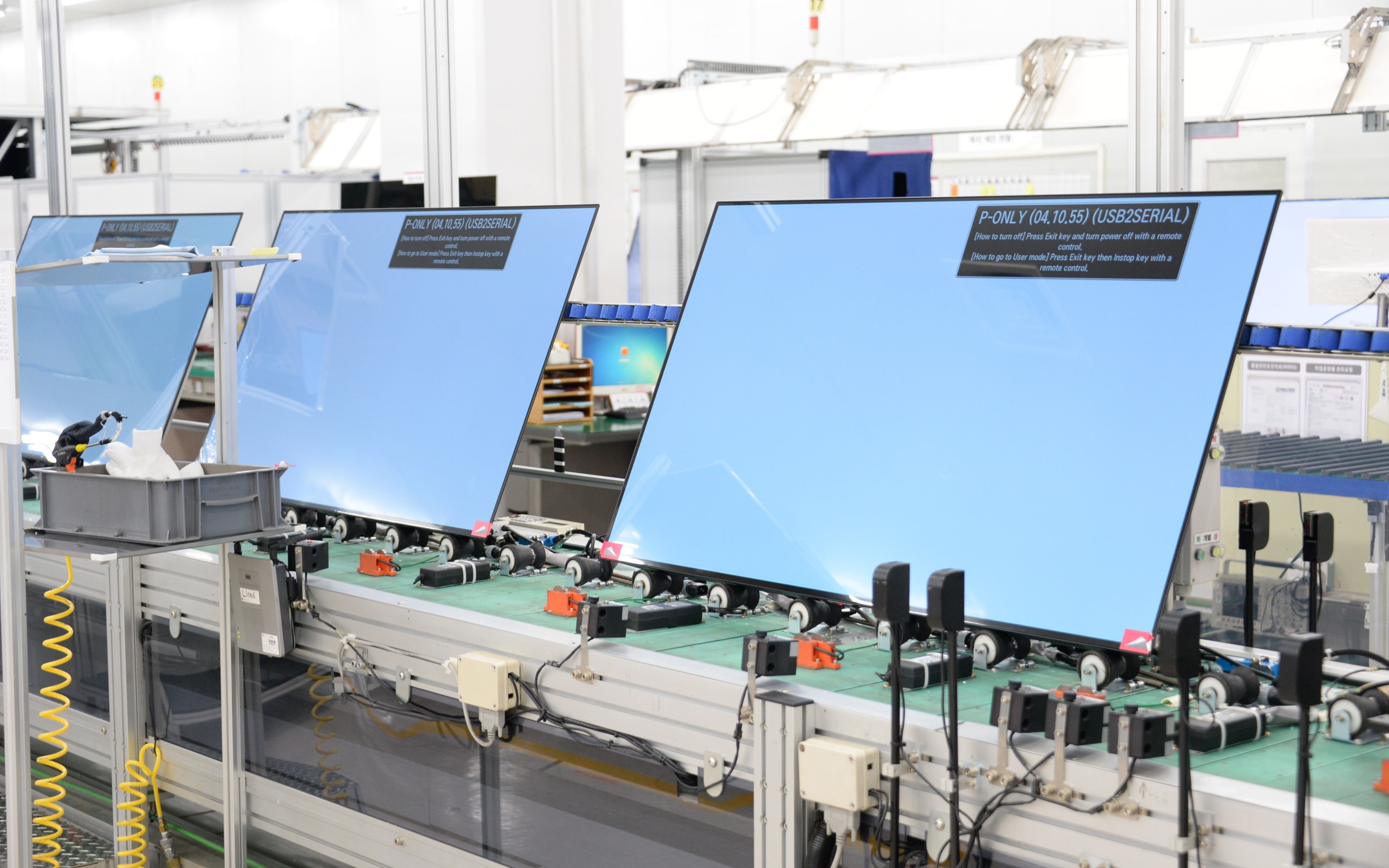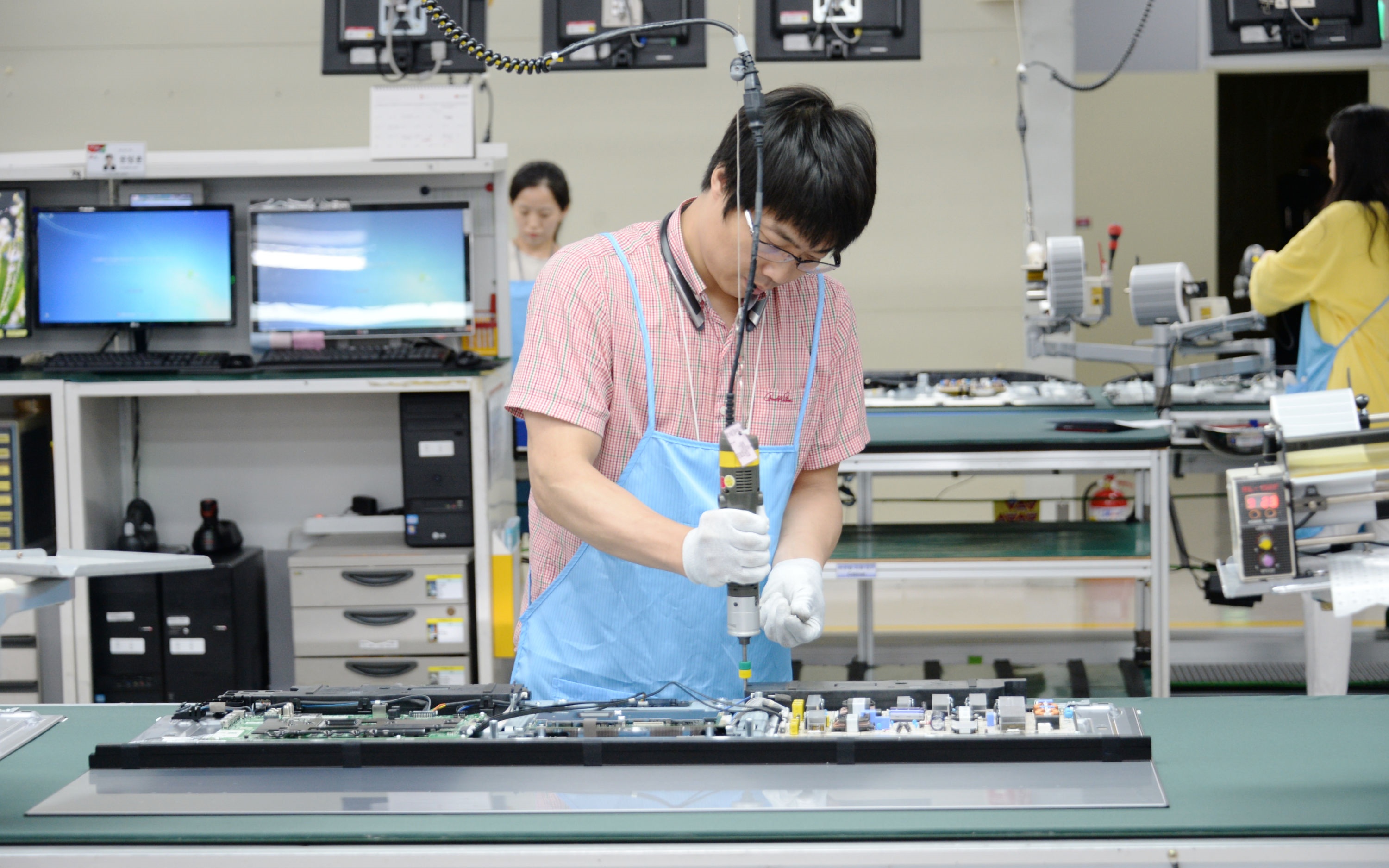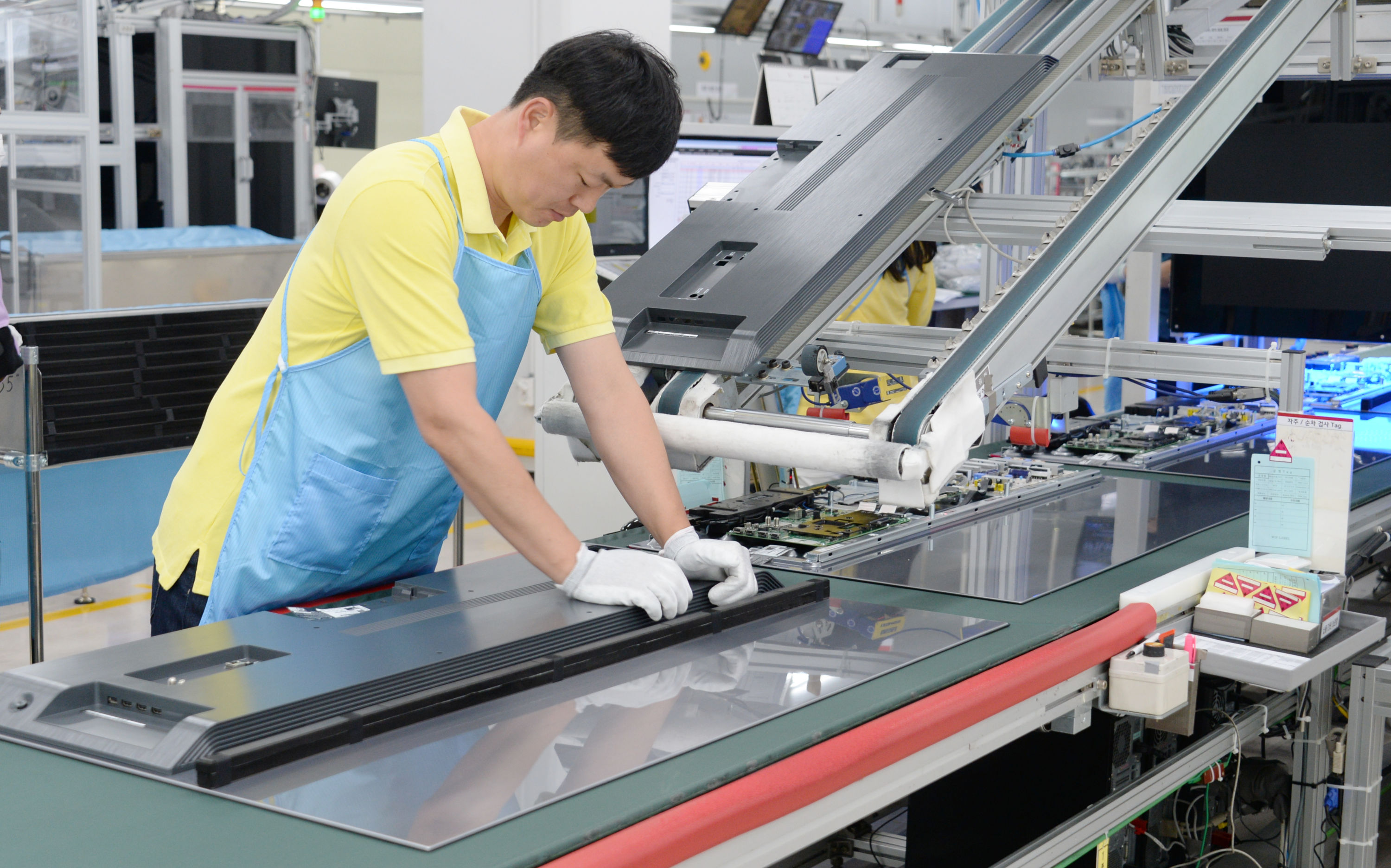 TV๊ฐ ์กฐ๋ฆฝ๋๋ ๋ผ์ธ ์์๋ ์ฌ๋ฌ ๋ชจ๋ํฐ๋ง ์ฅ๋น์ ์ ๋ฌธ ์ง์๋ค์ ๊ผผ๊ผผํจ์ผ๋ก ์ต์ข