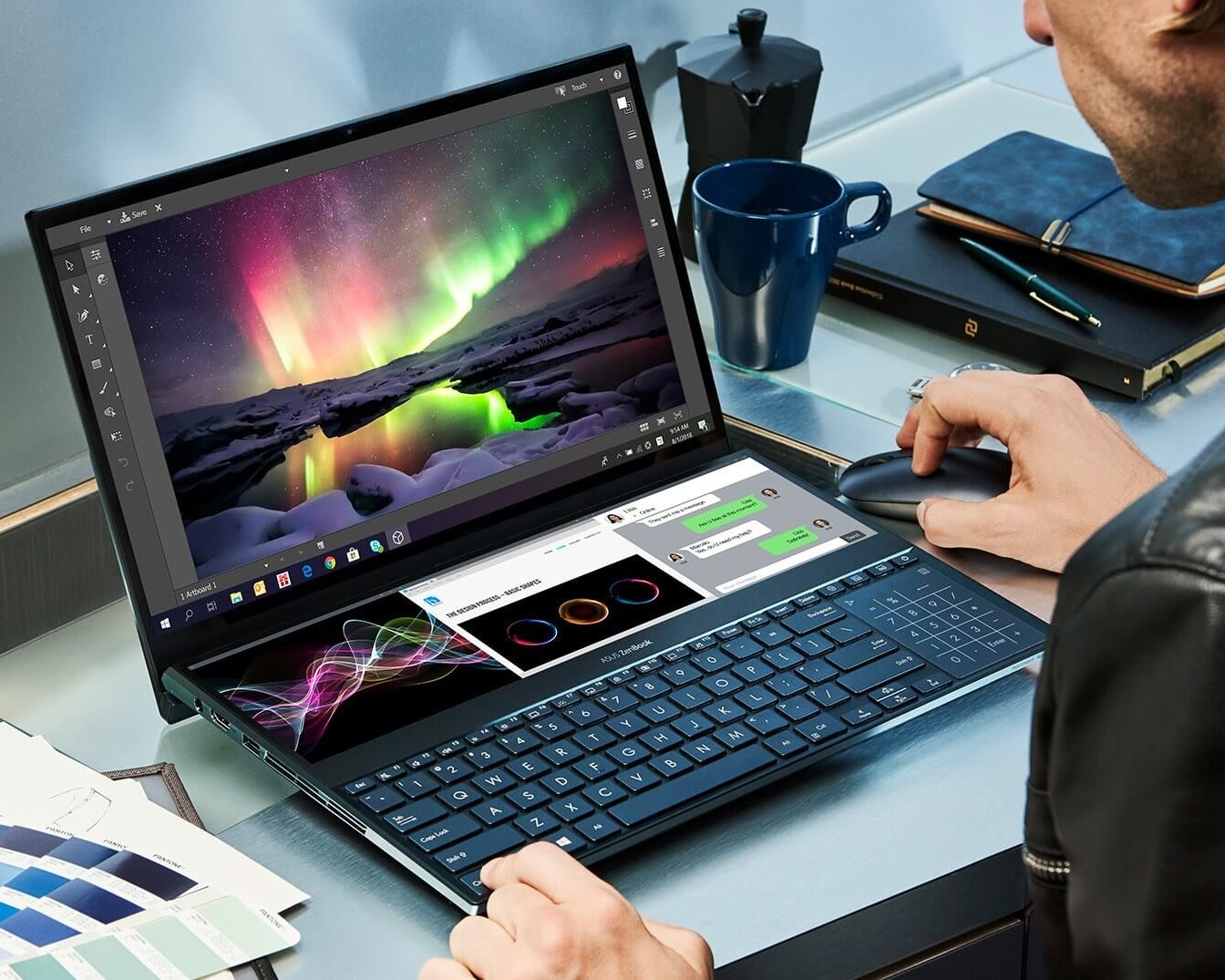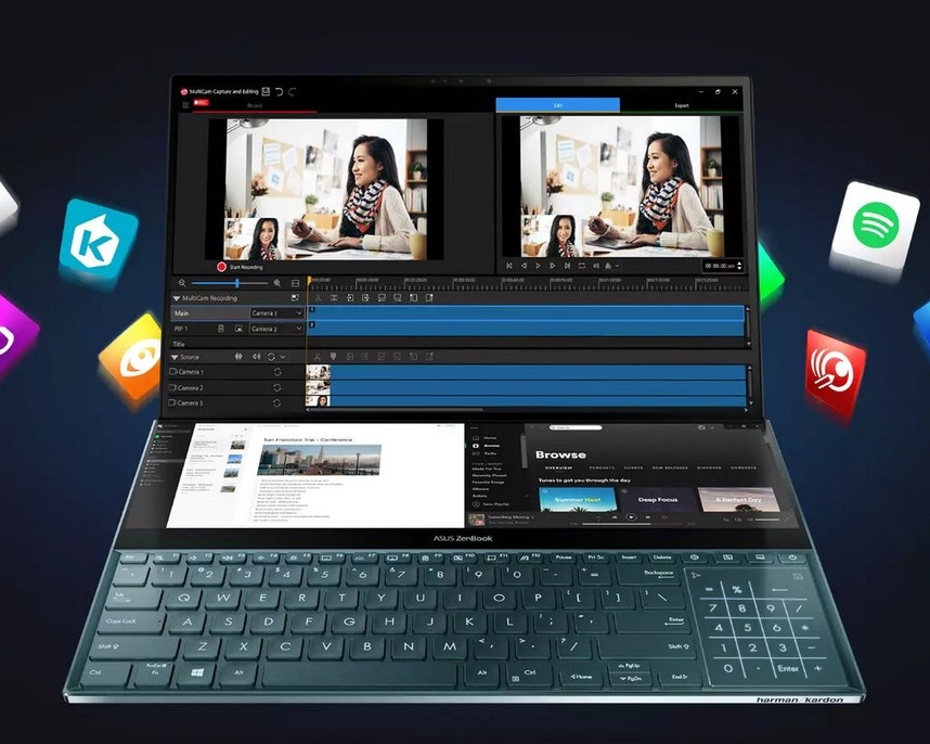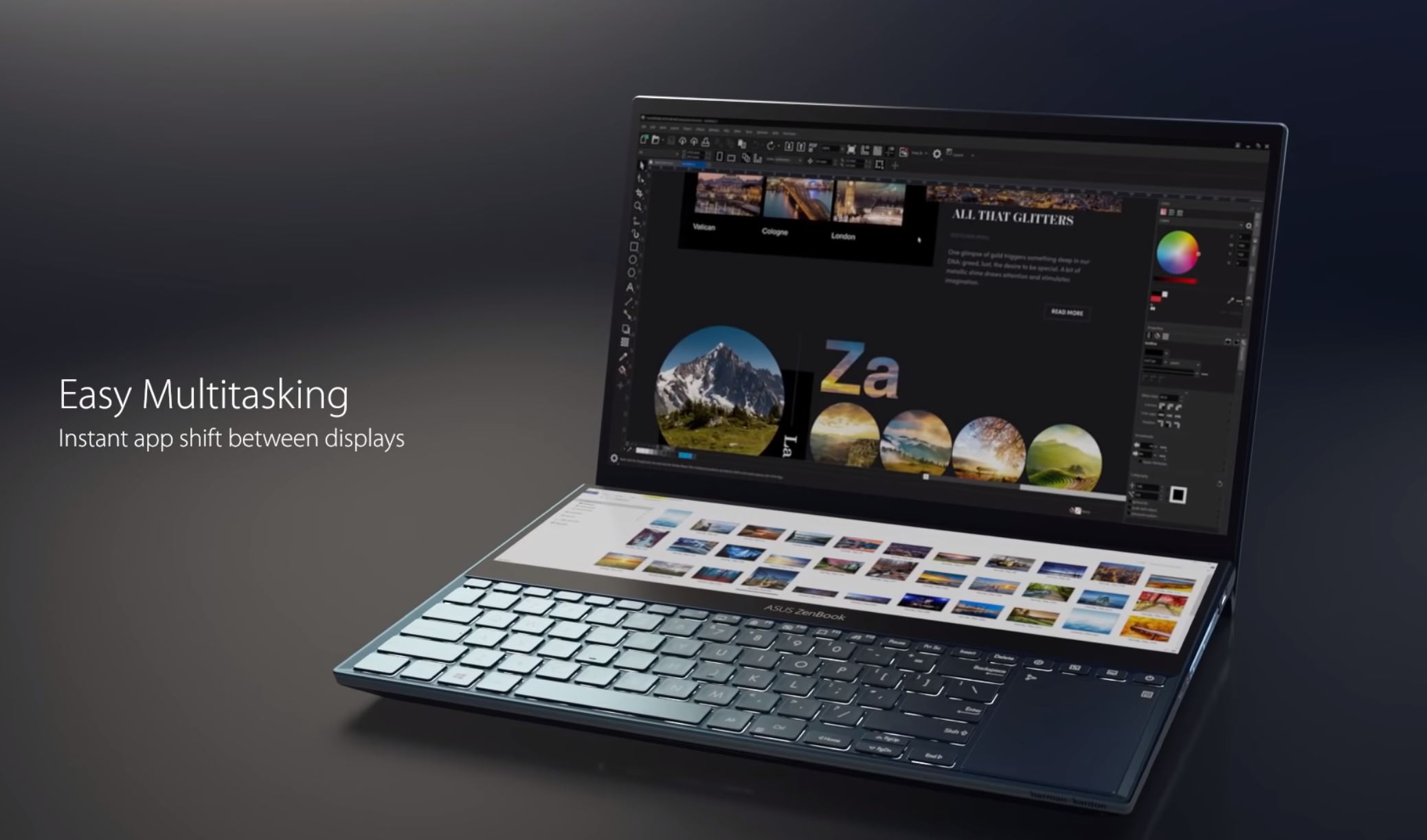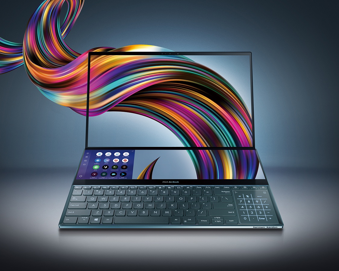 ZenBook Pro Duo features a 4K ScreenPad Plus that works with the main 4K OLED display, powered by Intel Core i9 CPU and NVIDIA GeForce RTX 2060 GPU.
