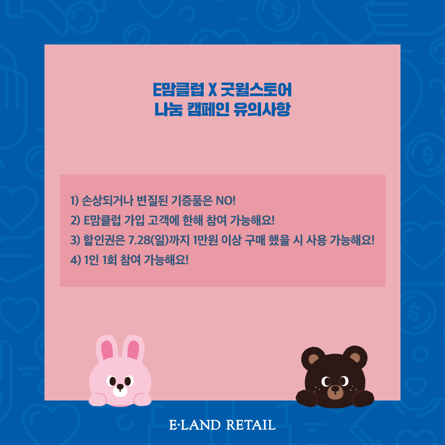 μΌ μ΅μμ μ¬μ©ν μ μλ λͺ¨λ°μΌ ν μΈκΆμ μ 곡νλ λ± λλ¦μ ννμ μ 곡νλκΉμ. μ΄λ κ² λ°μ λͺ¨λ°μΌ ν μΈκΆμ 7μ 28μΌκΉμ§ λ§€μ₯μμ 1λ§ μ μ΄μ μ ν ꡬ맀 μμ μ¬μ©ν μ μλ€κ³ νλλ° μμ΄λ€κ³Ό ν¨κ» κΈ°λΆμ μλ―Έλ₯Ό λμκΈΈ μ μμ μμν μ΄λ²€νΈ. 7μ 10μΌλΆν°λΌλ Eλ§ν΄λ½μ΄μλΌλ©΄ κΌ ν¨κ» ν΄λ³΄μΈμ. μμ§ Eλ§ν΄λ½μ΄ μλμλΌλ©΄ μ΄λλ리ν