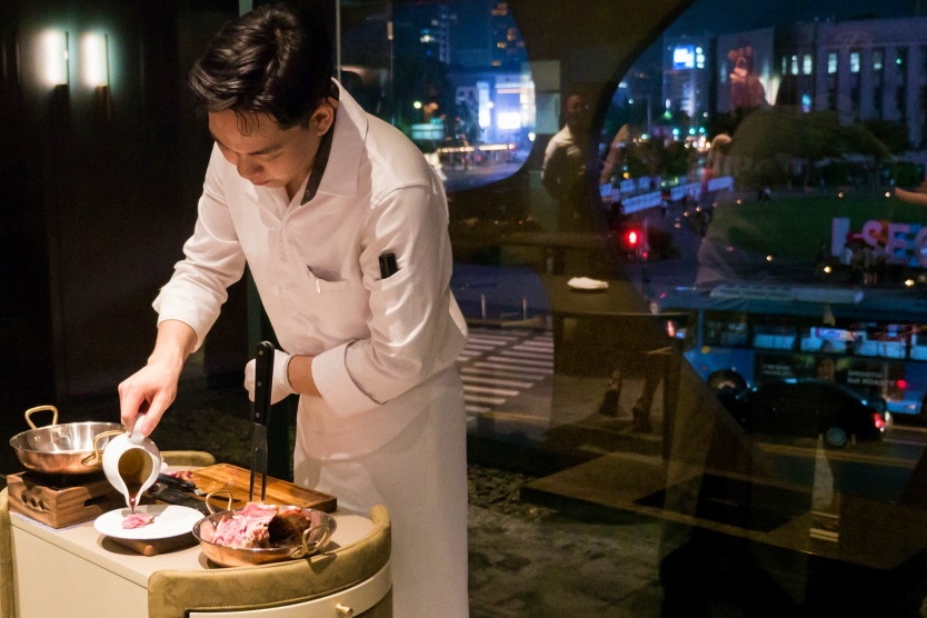 ฐํ์ ๋ชจ๋ ํ์ ๋ ์คํ ๋ ์ฃผ์ฅ๋ถํฐ ์๊ธฐํด์ผ ํ ๊ฒ ๊ฐ๋ค์. ๋ ํ๋ผ์ 3์ธต์ ์๋ค๋ ์ฃผ์ฅ์ ์ฅ๊ณผ ์์ด๋ฅผ ํ์ฉํด ํ๊ตญ์ ์ฌ๊ณ์ ์ ํํํ ์์์ ์ ๋ณด์ด๊ธฐ๋ก ์ ๋ช