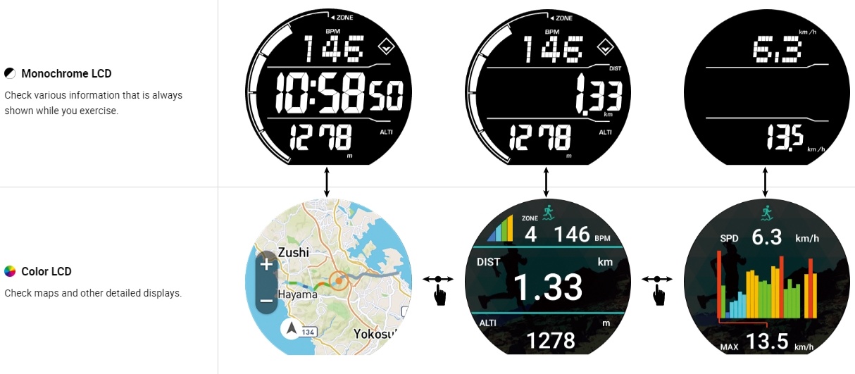 Product information of WSD-F21HR. Heart rate measurement & GPS, on a large LCD screen. Get data on your activity, making it even more enjoyable.