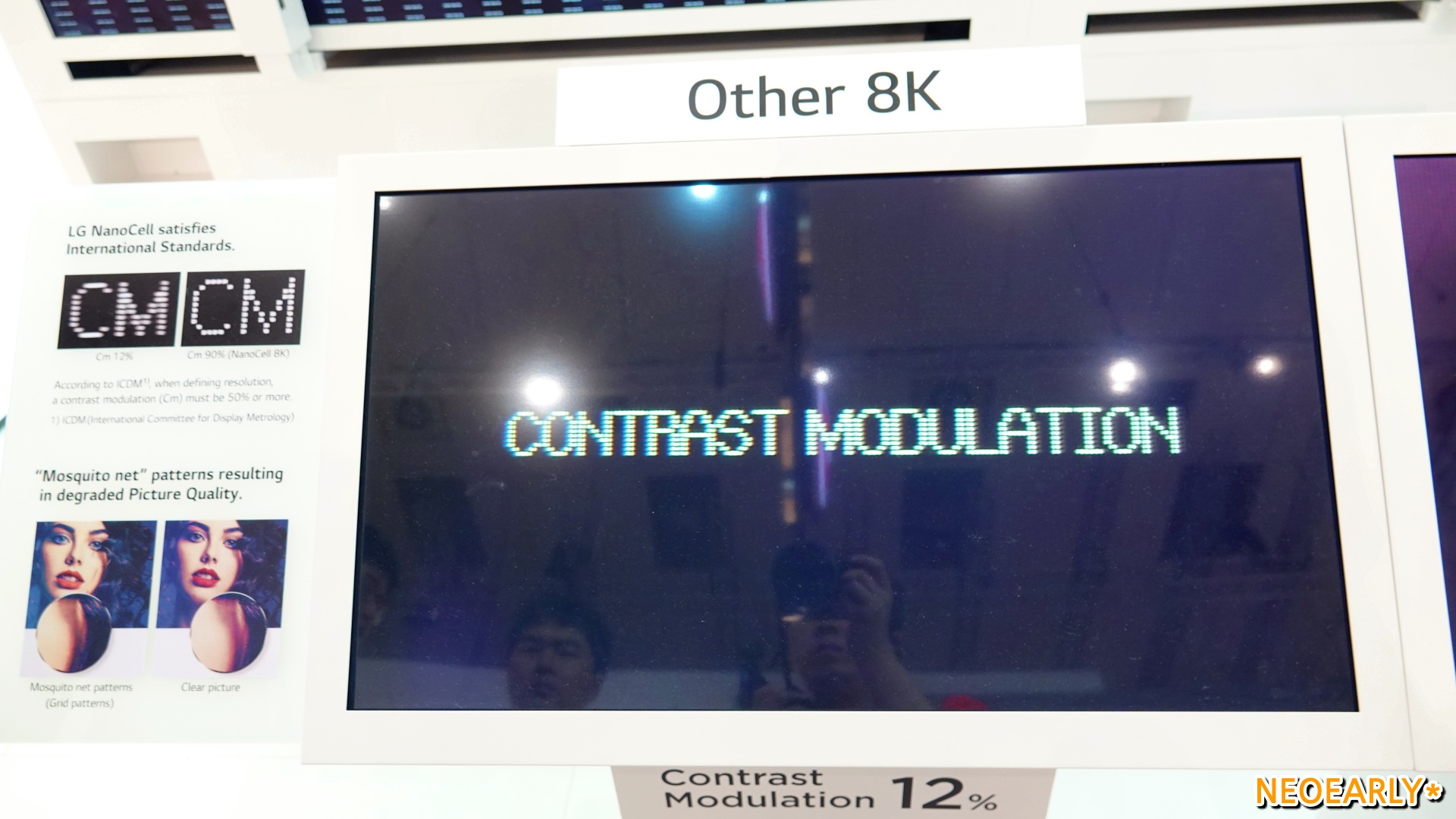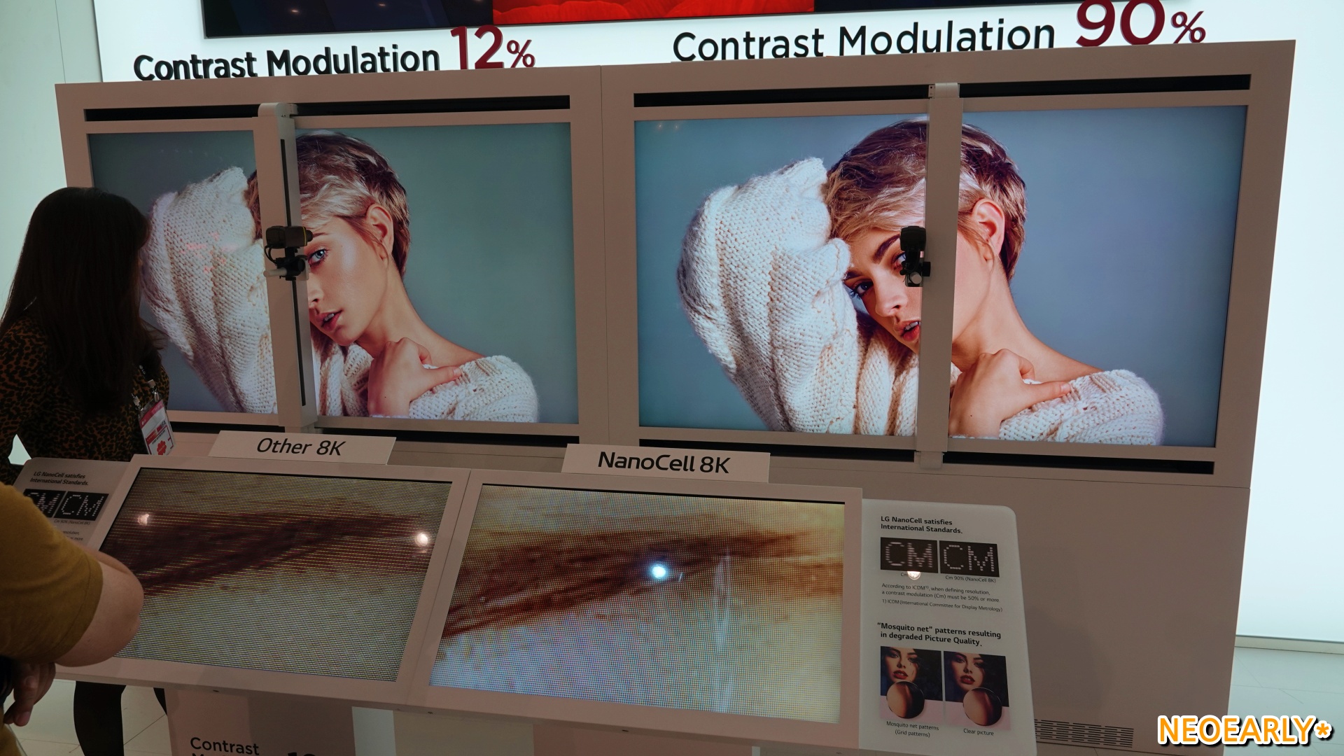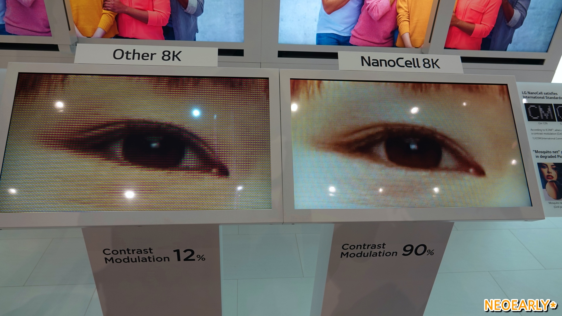 LG์ ์ ๋ถ์ค์์ ๋ง๋ ์ ์์๋ ๊ฑด ์ธ๊ณ ์ต์ด์ด์ ์ต๊ณ ์ ํ์ง์ ์๋ํ๋ 88์ธ์น ์ฌ๋ ๋ 8K TV(OLED 8K TV)์ LED LCD์ด๋ฉด์๋ ๊ฒฝ์์ฌ๋ฅผ ์๋ํ๋ ๋๋ ธ์ 8K TV(NanoCell 8K TV)์์ต๋๋ค. ๊ฐ๊ฐ ํ HD์ 16๋ฐฐ, 4K์ 4๋ฐฐ๋ ๋๋ 7680 x 4320์ ๋์ ํด์๋๊ฐ ์จํ ํ๋ฉด์ ๋ง๋ค์ด ๋ด๋๊ตฐ์. ์์ฅ์ ์ด๋๋ ๋์คํ๋ ์ด ๋ฆฌ๋๋ต๊ฒ LG์ ์์ 8K TV๋ ๋จ์ํ ํ์๋ง ๋ง์ ๊ฒ ์๋๋ผ ์๋ฑํ ํ์ง์ ๋ช ๋๋ฅผ ๋ํด ํ์ฅ์์ ๋ง๋ ๋ค์ํ 8K TV ์ค์์๋ ๊ตฐ๊ณ์ผํ์ ํ์ง์ ๋ณด์ฌ์คฌ๋๋ฐ์. 8K๋ผ๋ ํด์๋ ฅ์ ํํํ๊ธฐ ์ํด 3,300๋ง ๊ฐ๋ ๋๋ ํ์๋ ๊ธฐ๋ณธ์ด๊ณ ๋๋ ธ์ 8K TV๋ 90%, ์ฌ๋ ๋ 8K TV๋ 94% ๋ฑ ์๋์ ์ธ ํ์ง์ ๋ช ๋๋ฅผ ๋ํด ๊ทน๊ฐ์ ํ์ง์ ๋ณด์ฌ์ค๊ฑฐ์ฃ . ํ์ง์ ๋ช ๋๊ฐ ์๋์ ์ผ๋ก ๋จ์ด์ง๋ ํ์ฌ์ ๋ชจ๋ธ๊ณผ ๋ฌ๋ฆฌ 8K ๋์คํ๋ ์ด์ ๋ํ ํ์ค์ ์ธ์ฐ๋ ๊ตญ์ ๋์คํ๋ ์ด๊ณ์ธก์์ํ(ICDM)๊ฐ ์ธ์ด 8K TV์ ํ์ง์ ๋ช ๋ ๊ธฐ์ค์ธ 50%๋ฅผ ํ์ฉ ๋ฐ์ด๋๋ 90% ์์ค(๋๋ ธ์ TV ๊ธฐ์ค)์ ํ์ง์ ๋ช ๋๋ฅผ ์๋ํ๋ ๋ฆฌ์ผ 8K TV๋ค์ด ๋ชจ์ต์ด์์ฃ . ์ฌ๋ ๋ TV๊ฐ ์๋๋ผ LCD TV์ธ ๋๋ ธ์ 8K TV์์๋์.