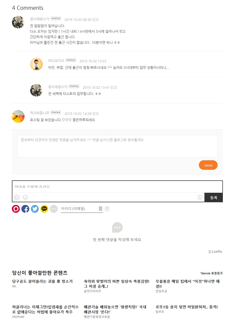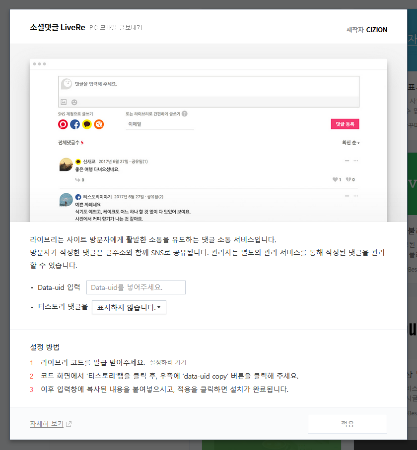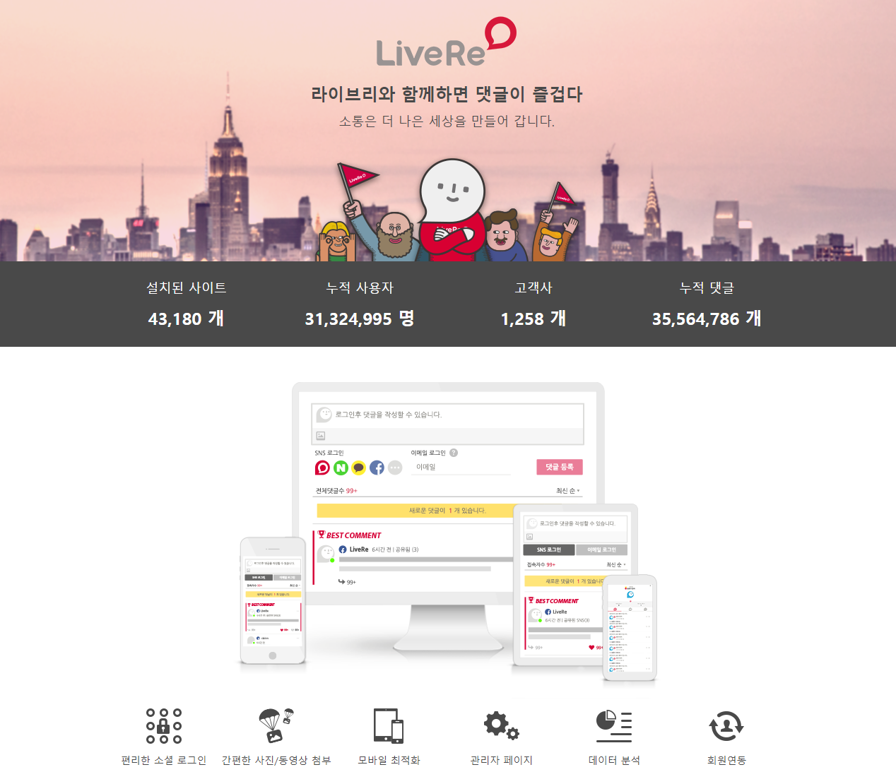 ํน์ ๊ทธ์ค์ ์์ ๋๊ธ ๋ผ์ด๋ธ๋ฆฌ(LiveRe)๋ผ๋ ํ๋ฌ๊ทธ์ธ์ ์จ๋ณด์ ์ ์ด ์์ผ์ ๊ฐ์? ์ด๋ฆ๋ง ๋ค์ผ๋ฉด ํ ๊ฐ์ด ์ ์ฌ ์๋ ์์ง๋ง, ์์ ๋๊ธ์ด๋ผ๋ ์ด๋ฆ์ฒ๋ผ ๋ผ์ด๋ธ๋ฆฌ๋ ์นด์นด์คํก, ๋ค์ด๋ฒ, ๊ตฌ๊ธ, ํ์ด์ค๋ถ, ํธ์ํฐ ๋ฑ ๋ค์ํ SNS ์๋น์ค์ ๊ณ์ ์ ์ด์ฉํ ์์ ๋ก๊ทธ์ธ์ผ๋ก ์ฝ๊ฒ ๋๊ธ์ ๋จ๊ธธ ์ ์๋๋ก ํ๊ณ ์๋ฆผ์ ์ ๊ณตํด ์ข ๋ ๋น ๋ฅธ ํผ๋๋ฐฑ๊ณผ ์ํต์ ๊ฐ๋ฅํ๊ฒ ํด ์ค๋๋ค. ํฐ์คํ ๋ฆฌ์ ๊ธฐ๋ณธ ๋๊ธ์์ ํ ์ ์๋ ์ด๋ฏธ์ง๋ ๋์์ ์ฒจ๋ถ๋ ๊ฐ๋ฅํ๊ณ , ๋๊ธ๊ณผ ๊ด๋ จ๋ ์์ธํ ํต๊ณ๋ ์ ๊ณตํ๊ณ ์.