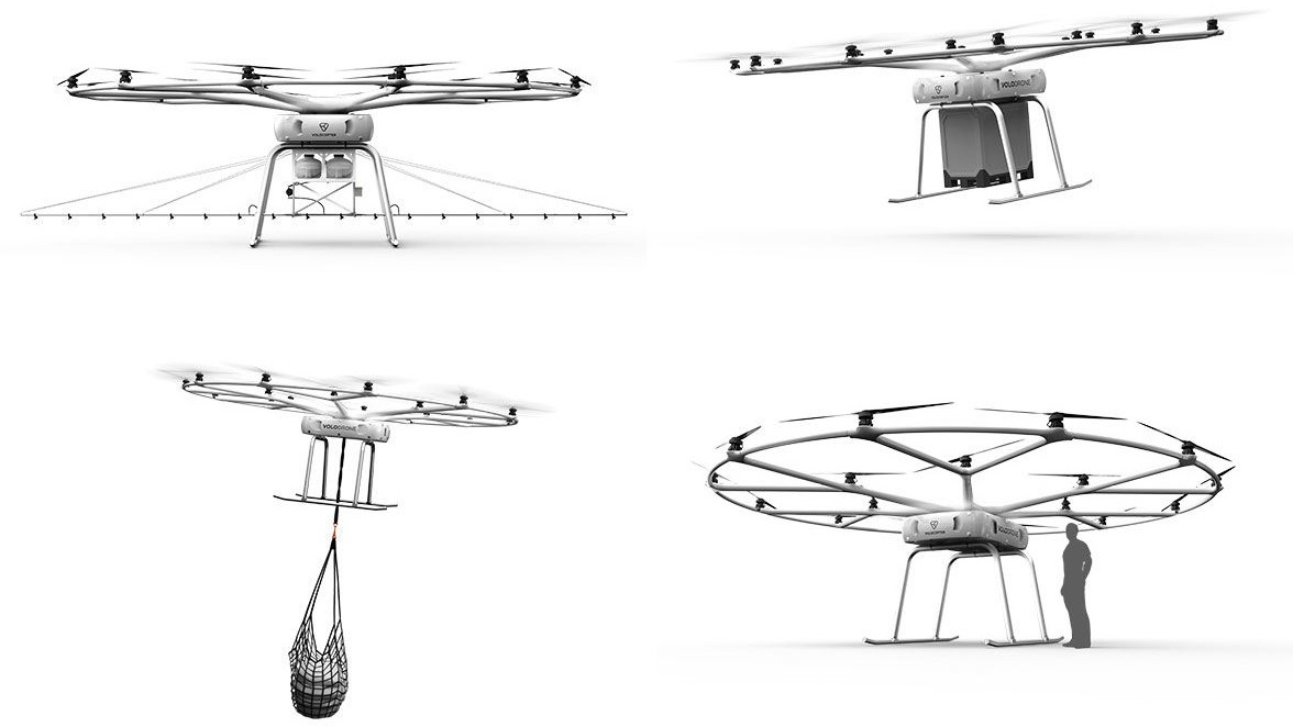 VoloDrone Sharing strong synergies with the existing Volocopter platform, the VoloDrone presents an unmanned, fully electric utility drone, capable of carrying an unprecedented payload. The VoloDrone has been designed and engineered to serve challenging mi