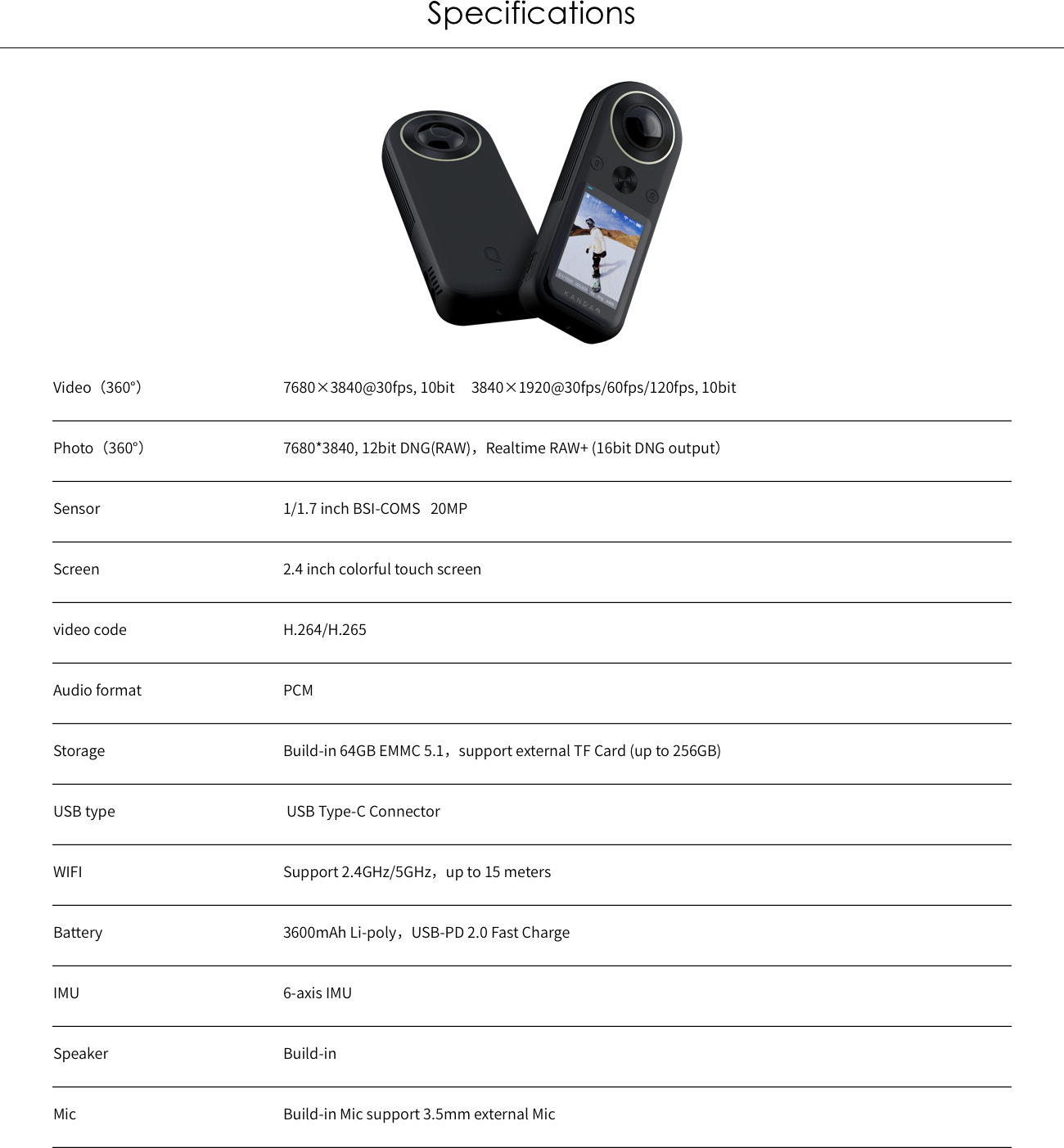 νμΊ 8Kλ μ, λ€μ 1/1.7μΈμΉ 2,000λ§ νμ BSI CMOS μΌμλ₯Ό νμ¬ν΄ 360λλ₯Ό λͺ¨λ μ°μ μ μλλ°μ. λμμμ 7680 x 3840 ν΄μλλ‘ 30fps, 3840 x 1920 ν΄μλλ‘ 30/60/120fpsλ‘ μ΄¬μν μ μκ³ μ¬μ§μ 7680 x 3840 ν΄μλλ‘ μ΄¬μν μ μλ€κ³ ν©λλ€. μμ΄νμ΄μ λΈλ£¨ν¬μ€ λ±μΌλ‘ 무μ μ°κ²°λ λκ³ 64GB μ μ₯ κ³΅κ° μΈμ λ§μ΄ν¬λ‘ SDλ μ§μνκ³ 2.4μΈμΉ OLED ν°μΉμ€ν¬λ¦°μΌλ‘ μ‘°μν μ μλλ‘ νλλ°μ.