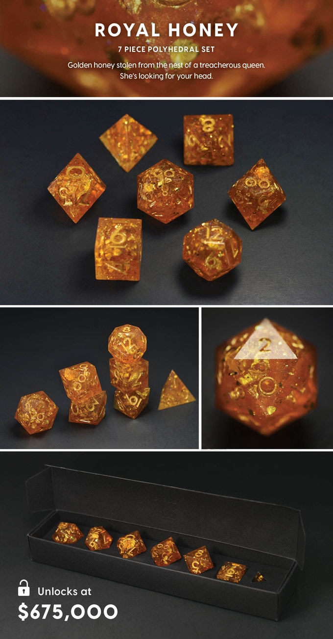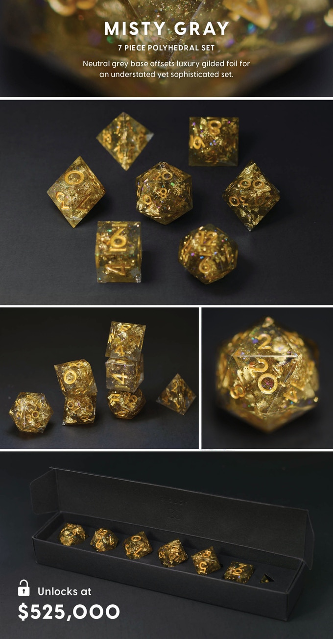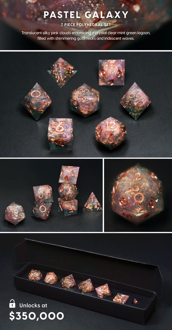 Handcrafted designer dice sets with sharp edges and beautiful inclusions for the aesthetic conscious tabletop RPG player. #RecognizeKSR