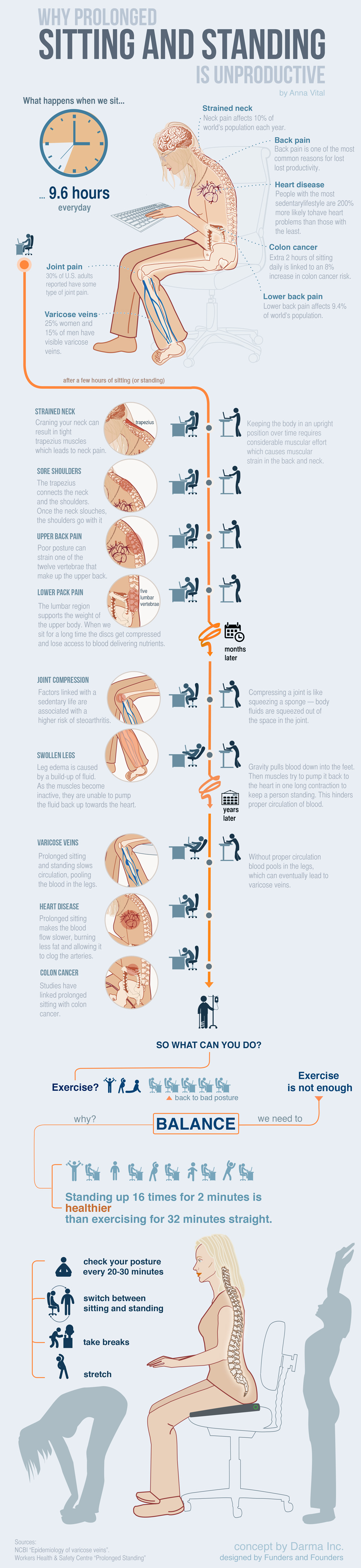 This infographic explains why prolonged sitting and standing is unproductive and how you can improve it. The key is balancing between sitting and standing.