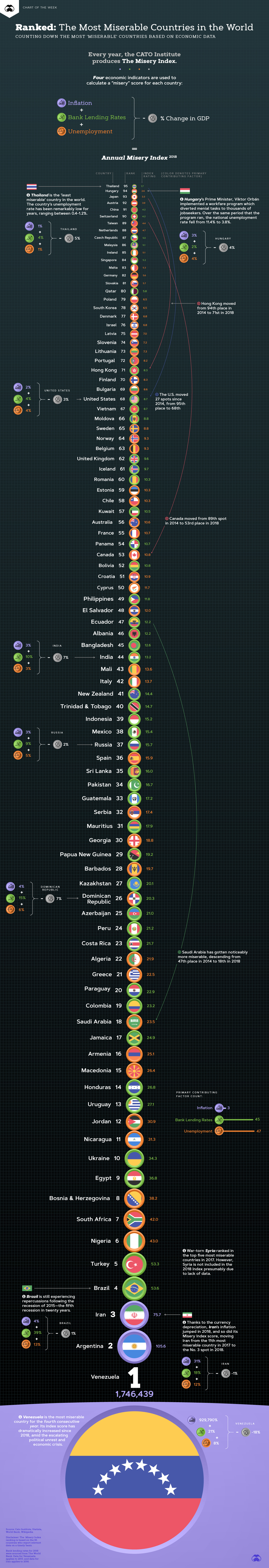 The annual Misery Index ranks the most and least miserable countries, based on four economic factors—unemployment, inflation, lending rates, and GDP growth.