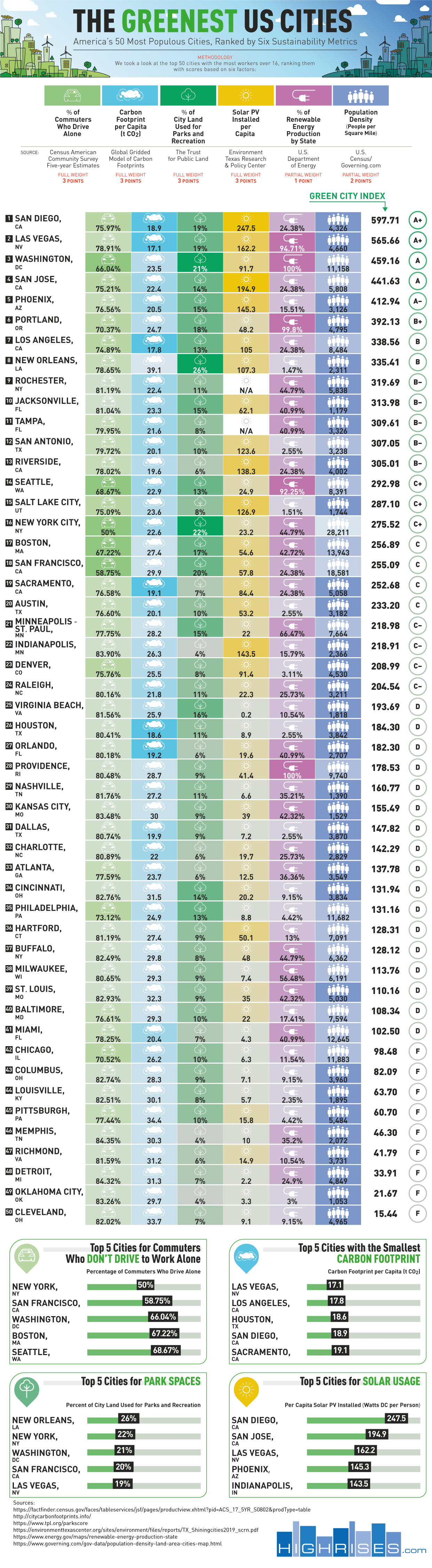 ๋ฐ์. HighRises๊ฐ ์ ๋ฆฌํ ์ด ์ธํฌ๊ทธ๋ํฝ์ ํ์๋ฐ์๊ตญ๊ณผ ๋์ฌ์ ๊ณต์ ๋น์จ, ํ์๊ด ์ค์น์จ, ์ฌ์ ๊ฐ๋ฅ ์๋์ง ์ฌ์ฉ๋ฅ , ์ธ๊ตฌ ๋ฐ๋ ๋ฑ์ ๋ฐํ์ผ๋ก ๋ฏธ๊ตญ ๋ด ๋์์ ์นํ๊ฒฝ ์ ๋๋ฅผ ๋น๊ตํด ์์๋ฅผ ๋งค๊ธฐ๊ณ ์๋๋ฐ์. ์ง์๊ฐ๋ฅ์ฑ์ ๊ธฐ์ค์ผ๋ก ๋ฏธ๊ตญ์์ ๊ฐ์ฅ ์ ๋ช