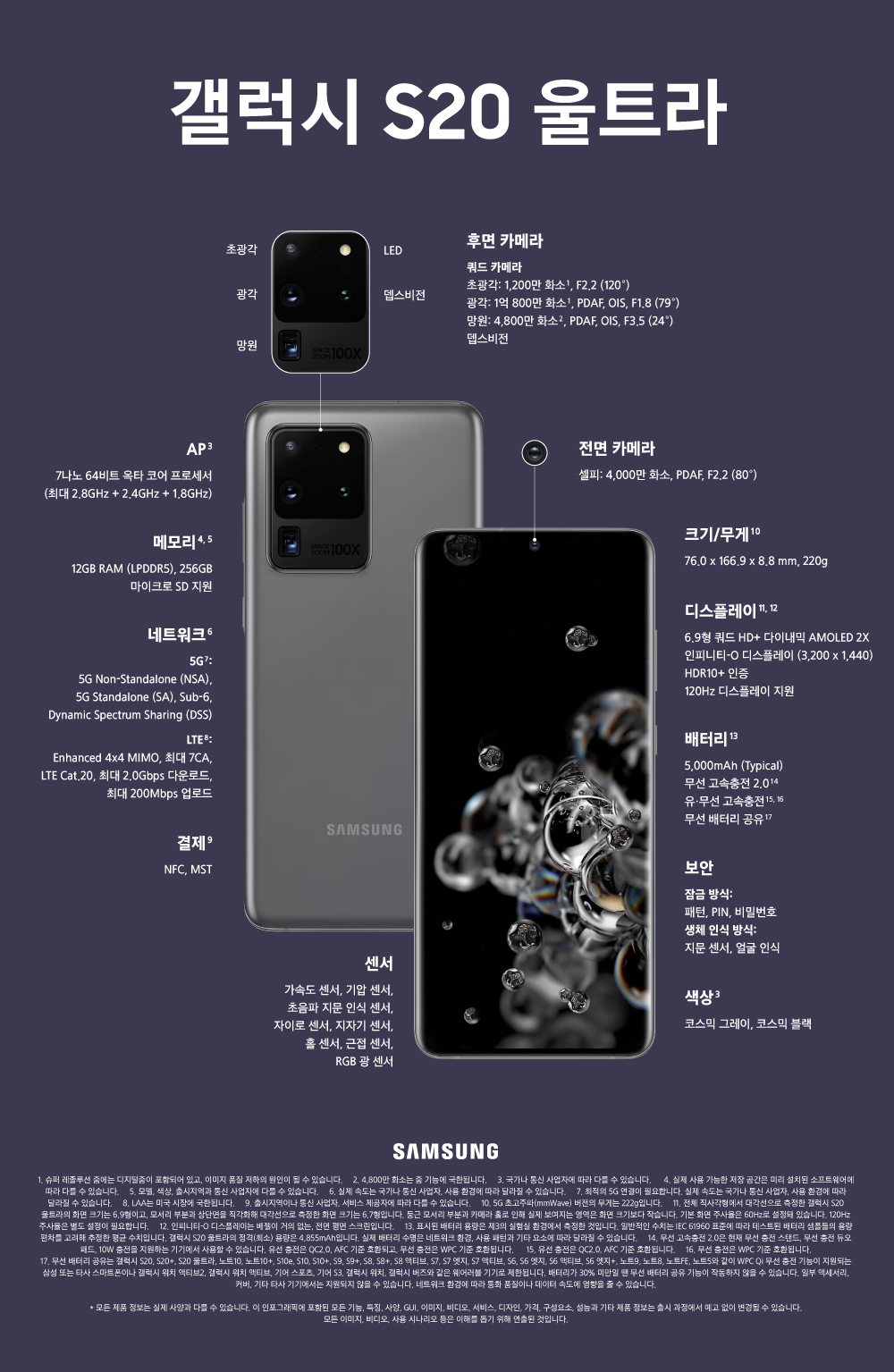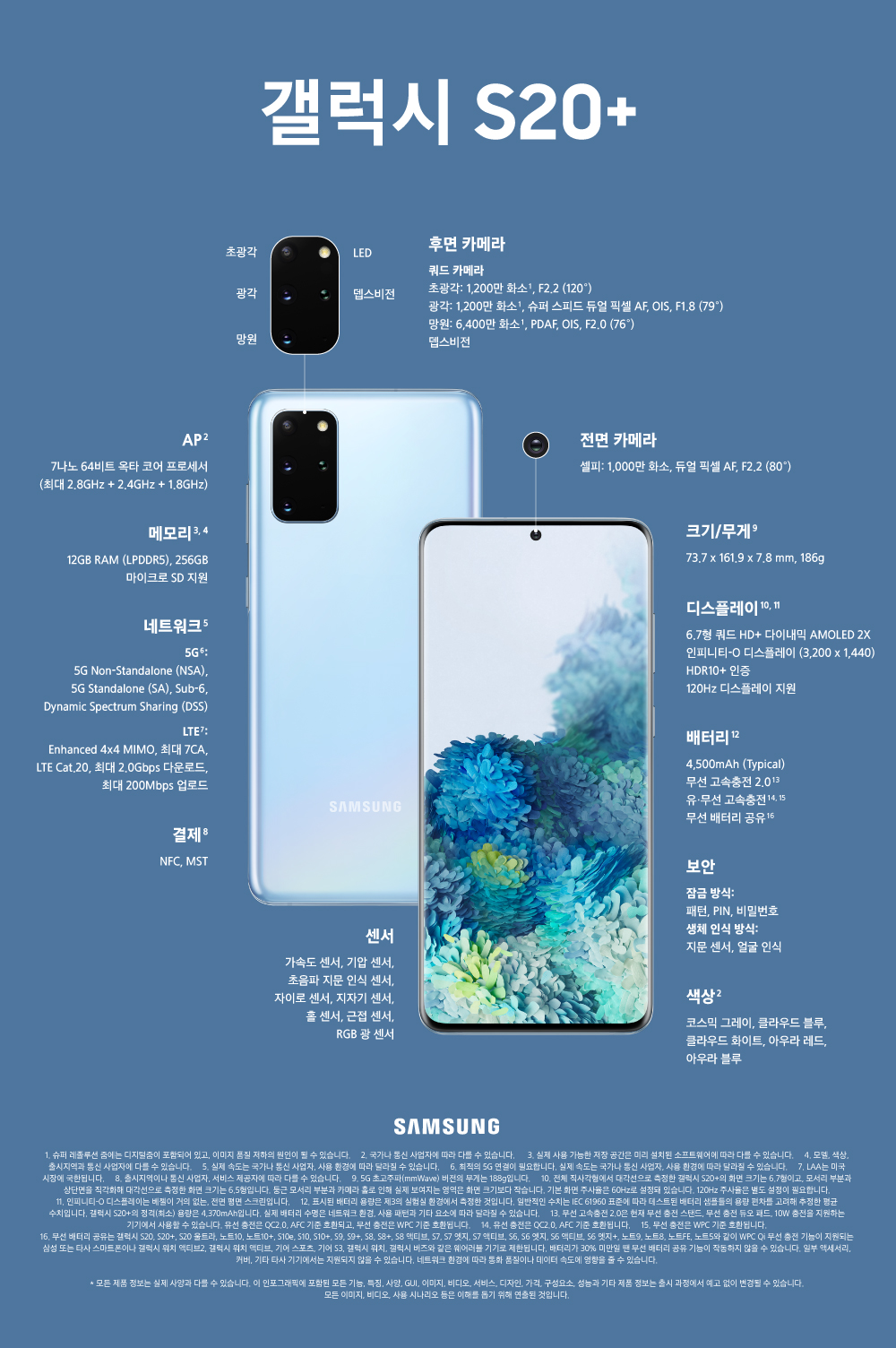 ๋๋๊ณค 865 ํ๋ก์ธ์, 12GB ๋จ, 128GB ์ ์ฅ ๊ณต๊ฐ(๋ง์ดํฌ๋ก SD ์ง์), ์ ๋ฉด 1,000๋ง(F/2.2) ํ์/ํ๋ฉด 6,400๋ง(F/2.0, ๋ง์)+1,200๋ง(F/1.8, ๊ด๊ฐ)+1,200๋ง(F/2.2, ์ด๊ด๊ฐ) ํ์ ํธ๋ฆฌํ ์นด๋ฉ๋ผ, ์์ดํ์ด 6, ๋ธ๋ฃจํฌ์ค 5.0, ๋์คํ๋ ์ด ์ง๋ฌธ ์ธ์, IP68๊ธ ๋ฐฉ์/๋ฐฉ์ง, 4,000mAh ์ผ์ฒดํ ๋ฐฐํฐ๋ฆฌ(๋ฌด์ ๋ฐฐํฐ๋ฆฌ ๊ณต์ , ๋ฌด์ ๊ธ์ ์ถฉ์ 2.0, 25W ๊ธ์ ์ถฉ์ ), ์๋๋ก์ด๋ 10 ๊ธฐ๋ฐ ๋ฑ์ด๊ณ ๊ฐค๋ญ์ S20+์ ๊ฐค๋ญ์ S20 ๋๋น 6.7์ธ์น๋ก ๋ ์ปค์ง ํ๋ฉด์ ์ ์ฅ ๊ณต๊ฐ์ 256GB๋ก ํ์ฅํ์ต๋๋ค. ํ๋ฉด ์นด๋ฉ๋ผ์ ๋์ค ๋น์ ์นด๋ฉ๋ผ๋ฅผ ํ๋ ๋ ๋ฌ์ ์ฟผ๋ ์นด๋ฉ๋ผ ๋๊ณ ๋ฐฐํฐ๋ฆฌ ์ฉ๋์ด 4,500mAh๋ก ๋์ด๋ฌ๊ณ ์. ์ต์์ ๋ชจ๋ธ์ธ ๊ฐค๋ญ์ S20 ์ธํธ๋ผ์ ๊ฒฝ์ฐ ์ฌ๊ธฐ์ ํ๋ฐ ๋ ๋์๊ฐ 6.9์ธ์น ํ๋ฉด์ ์ ๋ฉด 4,000๋ง(F/2.2) ํ์/ํ๋ฉด 10,800๋ง(F/1.8, ๊ด๊ฐ)+4,800๋ง(F/3.5, ๋ง์)+1,200๋ง(F/2.2, ์ด๊ด๊ฐ) ํ์+๋์ค๋น์ ๊น์ง ์ฟผ๋ ์นด๋ฉ๋ผ๋ฅผ ๊ฐ์ท๊ณ 5,000mAh ๋ฐฐํฐ๋ฆฌ(๋ณ๋ ์ด๋ํฐ ์ฌ์ฉ ์ ์ต๋ 45W ๊ธ์ ์ถฉ์ ) ๋ฑ ์ปค์ง ๋งํผ ์ฐจ๋ณํ๋ฅผ ๋ํ ๋ชจ์ต์