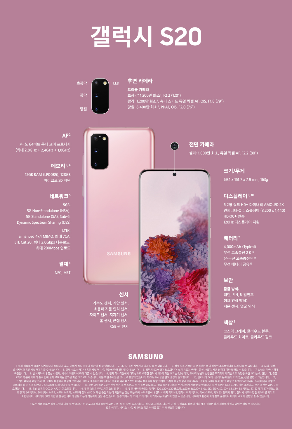 ๋๋๊ณค 865 ํ๋ก์ธ์, 12GB ๋จ, 128GB ์ ์ฅ ๊ณต๊ฐ(๋ง์ดํฌ๋ก SD ์ง์), ์ ๋ฉด 1,000๋ง(F/2.2) ํ์/ํ๋ฉด 6,400๋ง(F/2.0, ๋ง์)+1,200๋ง(F/1.8, ๊ด๊ฐ)+1,200๋ง(F/2.2, ์ด๊ด๊ฐ) ํ์ ํธ๋ฆฌํ ์นด๋ฉ๋ผ, ์์ดํ์ด 6, ๋ธ๋ฃจํฌ์ค 5.0, ๋์คํ๋ ์ด ์ง๋ฌธ ์ธ์, IP68๊ธ ๋ฐฉ์/๋ฐฉ์ง, 4,000mAh ์ผ์ฒดํ ๋ฐฐํฐ๋ฆฌ(๋ฌด์ ๋ฐฐํฐ๋ฆฌ ๊ณต์ , ๋ฌด์ ๊ธ์ ์ถฉ์ 2.0, 25W ๊ธ์ ์ถฉ์ ), ์๋๋ก์ด๋ 10 ๊ธฐ๋ฐ ๋ฑ์ด๊ณ ๊ฐค๋ญ์ S20+์ ๊ฐค๋ญ์ S20 ๋๋น 6.7์ธ์น๋ก ๋ ์ปค์ง ํ๋ฉด์ ์ ์ฅ ๊ณต๊ฐ์ 256GB๋ก ํ์ฅํ์ต๋๋ค. ํ๋ฉด ์นด๋ฉ๋ผ์ ๋์ค ๋น์ ์นด๋ฉ๋ผ๋ฅผ ํ๋ ๋ ๋ฌ์ ์ฟผ๋ ์นด๋ฉ๋ผ ๋๊ณ ๋ฐฐํฐ๋ฆฌ ์ฉ๋์ด 4,500mAh๋ก ๋์ด๋ฌ๊ณ ์. ์ต์์ ๋ชจ๋ธ์ธ ๊ฐค๋ญ์ S20 ์ธํธ๋ผ์ ๊ฒฝ์ฐ ์ฌ๊ธฐ์ ํ๋ฐ ๋ ๋์๊ฐ 6.9์ธ์น ํ๋ฉด์ ์ ๋ฉด 4,000๋ง(F/2.2) ํ์/ํ๋ฉด 10,800๋ง(F/1.8, ๊ด๊ฐ)+4,800๋ง(F/3.5, ๋ง์)+1,200๋ง(F/2.2, ์ด๊ด๊ฐ) ํ์+๋์ค๋น์ ๊น์ง ์ฟผ๋ ์นด๋ฉ๋ผ๋ฅผ ๊ฐ์ท๊ณ 5,000mAh ๋ฐฐํฐ๋ฆฌ(๋ณ๋ ์ด๋ํฐ ์ฌ์ฉ ์ ์ต๋ 45W ๊ธ์ ์ถฉ์ ) ๋ฑ ์ปค์ง ๋งํผ ์ฐจ๋ณํ๋ฅผ ๋ํ ๋ชจ์ต์