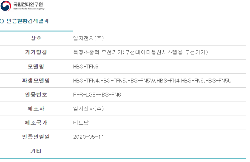 LG์ ์ ์ ํค ํ๋ฆฌ ์ ํ์ธ์ฆ HBS-TFN4, HBS-TFN5, HBS-TFN6
