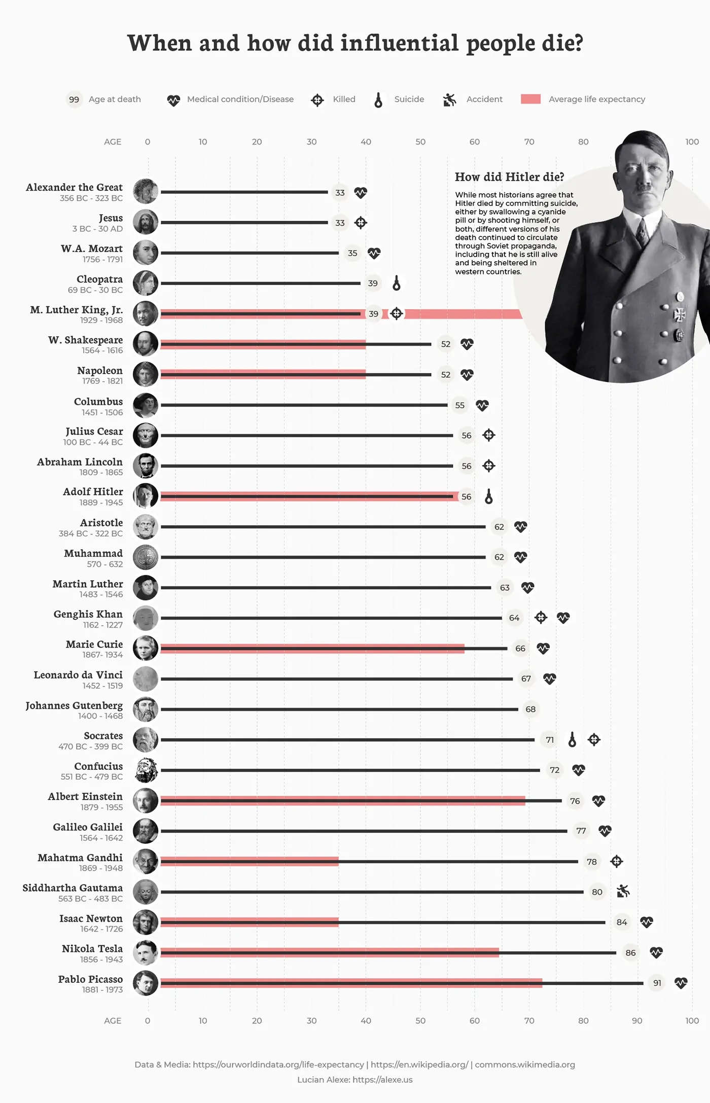 Lucian Alexe๊ฐ ์ ๋ฆฌํ ์ด ์ธํฌ๊ทธ๋ํฝ์๋ ๊ทธ๋ ๊ฒ ์ธ๋ฅ ์ญ์ฌ์ ์ ์์ ์ํฅ์ ๋ผ์น ์ธ๋ฌผ์ ์๋ชฐ ์๊ธฐ์ ๋์ด, ์ฃฝ์์ ์์ธ์ด ๋ด๊ฒจ ์๋๋ฐ์. ์ผ๋ถ ์ธ๋ฌผ์๋ ๊ธฐ๋์๋ช