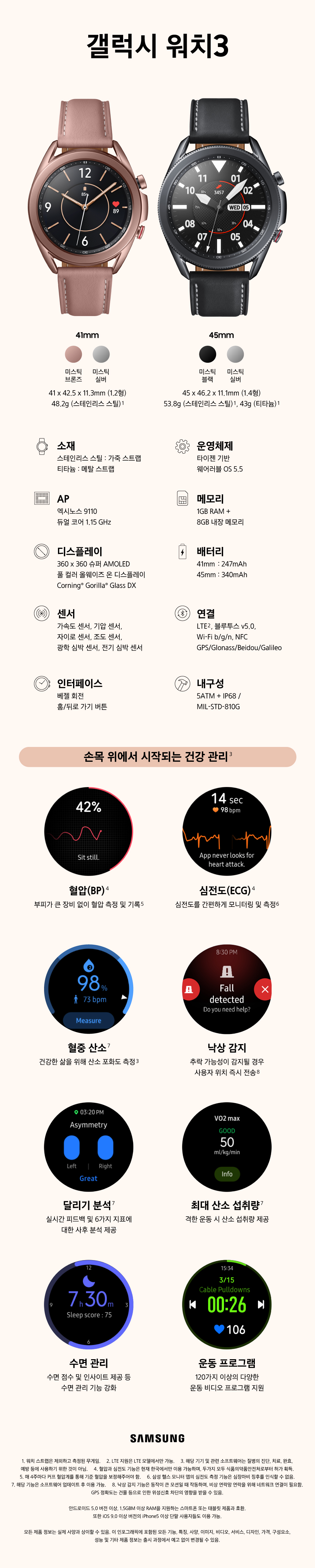 ธ์ค 9110 ๋์ผ ์ฝ์ด ํ๋ก์ธ์, 1GB ๋จ, 8GB ์ ์ฅ ๊ณต๊ฐ, ์์ดํ์ด 802.11 b/g/n, ๋ธ๋ฃจํฌ์ค 5, NFC, GPS ๋ฑ์ ํ์ฌํ๊ณ IP68๊ณผ 5ATM ๋ฐฉ์ ๋ฑ๊ธ์ ๋ฐ์คํ(MIL-STD 810G), ๋ฌด์ ์ถฉ์ ๋ฑ์ ์ง์ํฉ๋๋ค. 41mm์ 45mm ๋ ๊ฐ์ง ํ์