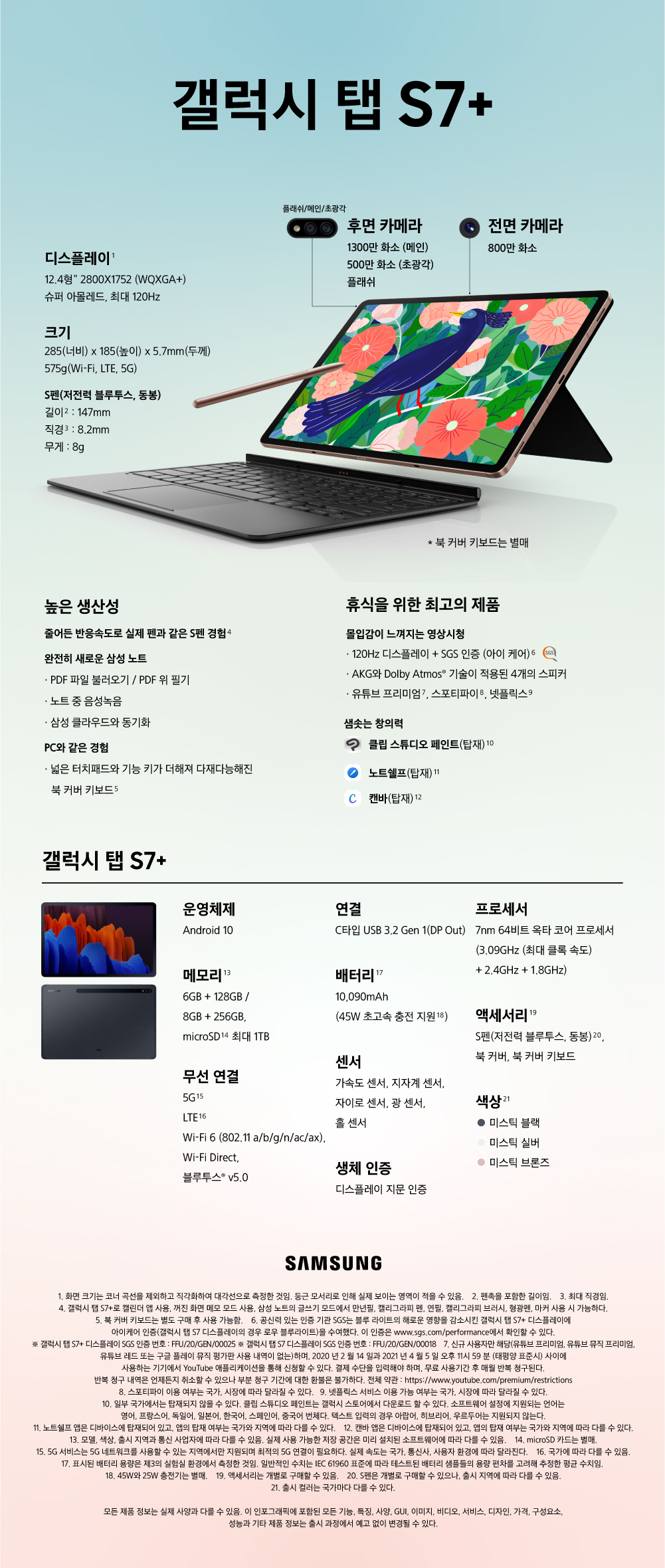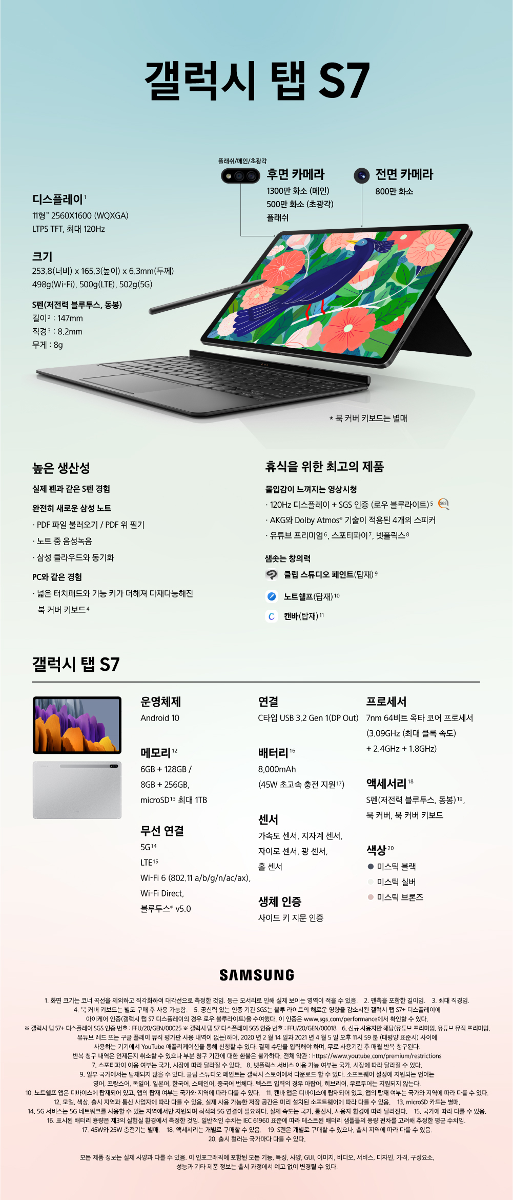 μ¬μμ κ°€λμ ν S7μ΄ 11μΈμΉ WQXGA(2560 x 1600) LCD ν°μΉ μ€ν¬λ¦°, 6/8GB λ¨, 128/256GB μ μ₯ 곡κ°(λ§μ΄ν¬λ‘ SD), μ λ©΄ 800λ§ νμ/νλ©΄ 1,300λ§+500λ§ νμ λμΌ μΉ΄λ©λΌ, μμ΄νμ΄ 6, λΈλ£¨ν¬μ€ 5, μΏΌλ μ€νΌμ»€, λλΉ μ νΈλͺ¨μ€, 8,000mAh μΌμ²΄ν λ°°ν°λ¦¬(45W κΈμ μΆ©μ )μ΄κ³ κ°€λμ νS7+λ 12.4μΈμΉ WQXGA+(2800 x 1752) μνΌ AMOLED ν°μΉ μ€ν¬λ¦°, 8GB λ¨, 256GB μ μ₯ 곡κ°(λ§μ΄ν¬λ‘ SD), 10,090mAh μΌμ²΄ν λ°°ν°λ¦¬(45W κΈμ μΆ©μ ) λ± λμ€νλ μ΄λΆν° λ°°ν°λ¦¬ λ±μμ μ°¨μ΄λ₯Ό 보μ