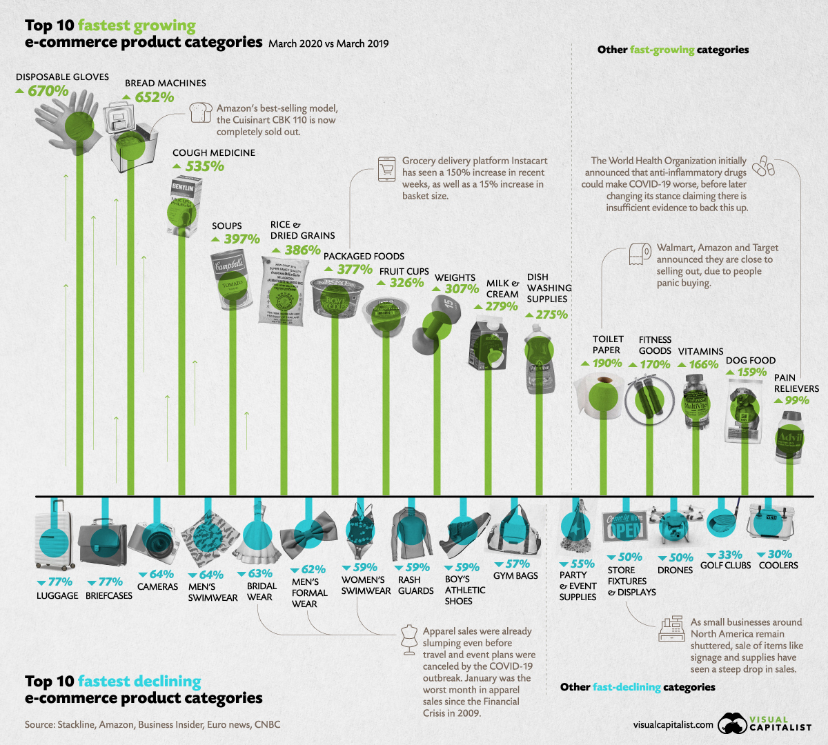 We visualize the ecommerce categories that have experienced the fastest growth, and the categories that are in decline during the COVID-19 pandemic.