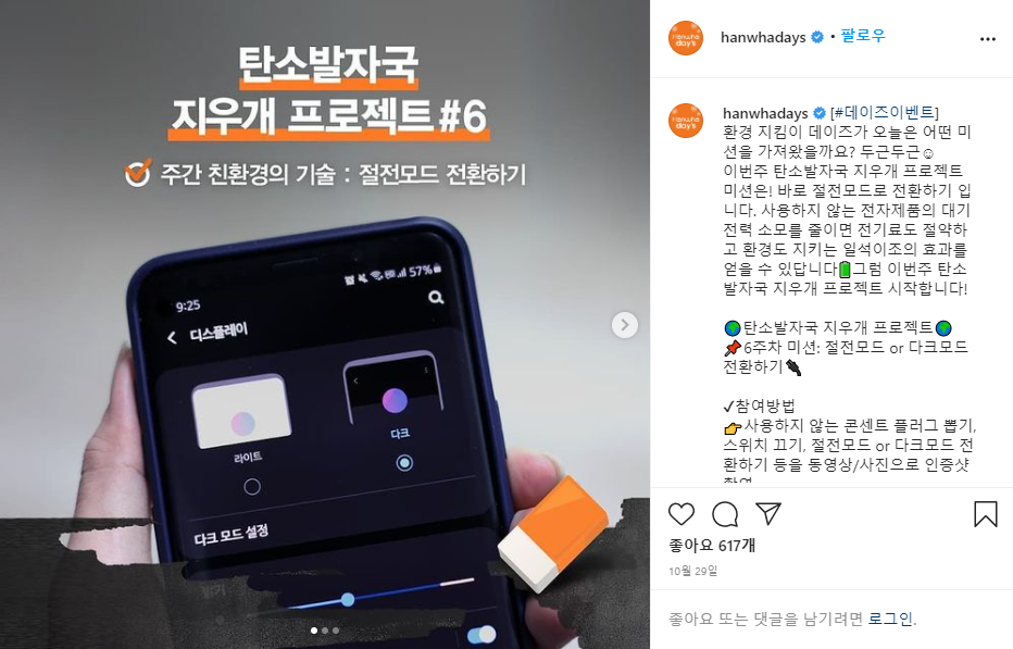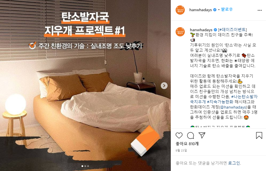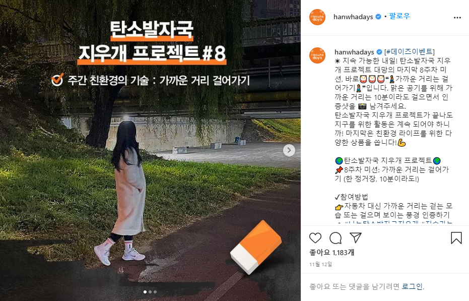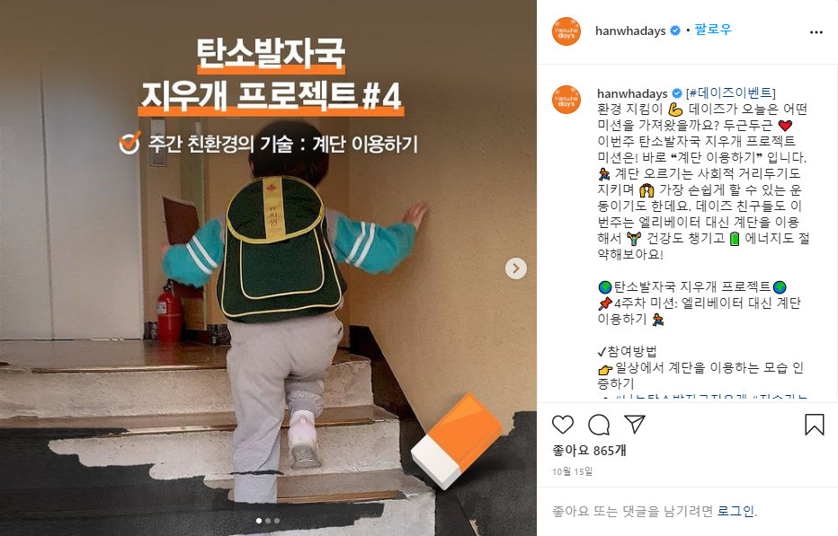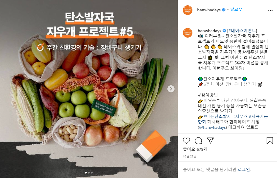 1์ฃผ์ฐจ ์ค๋ด์กฐ๋ช ์กฐ๋ ๋ฎ์ถ๊ธฐ, 2์ฃผ์ฐจ ๋์๋ฝํต ์ฌ์ฉํ๊ธฐ, 3์ฃผ์ฐจ ๋ถ๋ฆฌ๋ฐฐ์ถ ์ํ๊ธฐ, 4์ฃผ์ฐจ ๊ณ๋จ ์ค๋ฅด๊ธฐ, 5์ฃผ์ฐจ ์ฅ๋ฐ๊ตฌ๋ ์ฑ๊ธฐ๊ธฐ, 6์ฃผ์ฐจ ์ ์ ๋ชจ๋ ์ ํํ๊ธฐ, 7์ฃผ์ฐจ ํ ๋ธ๋ฌ ์ฌ์ฉํ๊ธฐ, 8์ฃผ์ฐจ ๊ฐ๊น์ด ๊ฑฐ๋ฆฌ ๊ฑธ์ด๊ฐ๊ธฐ ๋ฑ ์ด์ฉ๋ฉด ์ด๋ฏธ ๋ง์ ๋ถ๋ค์ด ํ๊ณ ๊ณ์ค ๊ทธ๋ฐ ์์ํ์ง๋ง, ์ง๊ตฌ๋ฅผ ์ด๋ฆฌ๊ณ ์ฐ๋ฆฌ ํ๊ฒฝ์ ๋์ด์๋๊ฒ ํ ๊ฒ๋ค์ ๊ณผ์ ๋ก ์ ์ํ๊ณ ์ฐธ์ฌ๋ฅผ ๋ ๋ คํ์ฃ . ์ฐธ์ฌ ๋ฐฉ๋ฒ๋ ๊ฐ๋จํด์ ๊ฐ๊ฐ์ ๊ณผ์ ๋ฅผ ์ธ์ฆํ๋ ์ฌ์ง์ ์์ ์ ์ธ์คํ๊ทธ๋จ์ ์ฌ๋ฆฌ๊ณ #๋๋ํ์๋ฐ์๊ตญ์ง์ฐ๊ฐ #์ง์๊ฐ๋ฅํํ ๊ฐ์ ํ๊ทธ๋ฅผ ํจ๊ป ์ฌ๋ฆฌ๋ฉด ๋๋ ๊ฑฐ์์ฃ .^^