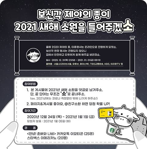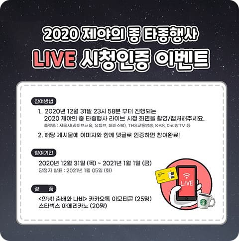 ์จ๋ผ์ธ ํ์ข ํ์ฌ๋ ๋ผ์ด๋ธ ์์ธ, ์ ํ๋ธ, ํ์ด์ค๋ถ, TBS ๊ตํต๋ฐฉ์ก, KBS, ์๋ฆฌ๋TV ๋ฑ ๋ค์ํ ์ฑ๋์ ํตํด ์งํ๋๋ฉฐ 12์ 31์ผ, ๊ทธ๋ฌ๋๊น ์ค๋ ๋ฐค 11์ 30๋ถ๋ถํฐ 2021๋ 1์ 1์ผ 00์ 10๋ถ๊น์ง ์ค๊ณ๋๋ค๊ณ ํ๋ ์ง์์ ๊ฐ์กฑ๋ค๊ณผ ํจ๊ป ๋ฐ๋ปํ๊ฒ ๋ณด์๋ฉด ์ข๊ฒ ๋ค์. ์คํ๋ผ์ธ ํ์ฌ๊ฐ ์๋ ๋งํผ ๊ทผ์ฒ ๋๋ก ํต์ ๋ ์๋ค๋ ๊ตณ์ด ํ์ฅ ๊ทผ์ฒ์์ ์ธ๋ฐ ํํ๋ก ์ฐพ์์จ ๊ฐ์ถ์์ ๋จ์ง ๋ง์๊ณ ์. ๋น๋๋ฉด ํ์ฌ๋ผ๊ณ ์์ฌ์ํ ๋ถ์ ์ํด '๋ณด์ ๊ฐ ์ ์ผ์ ์ข ์ด 2021 ์ํด ์์์ ๋ค์ด์ฃผ๊ฒ ์'๋ '2020 ์ ์ผ์ ํ์ข ํ์ฌ LIVE ์์ฒญ ์ธ์ฆ ์ด๋ฒคํธ' ๋ฑ์ด ์งํ๋๋ ์์ ํ ์ด๋ถ์์์ ์ฐธ์ฌํด ๋ณด์ธ์.^^