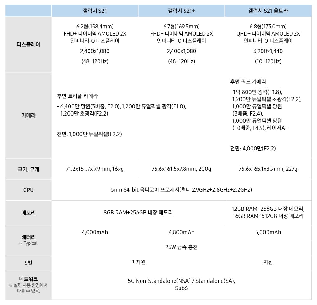 ์ต์์ ๋ชจ๋ธ์ธ ๊ฐค๋ญ์ S21 ์ธํธ๋ผ(Galaxy S21 Ultra)๋ ๋๋๊ฐ ๋ ํ๋ก์ธ์๋ ๋ค๋ฅธ ๋ชจ๋ธ๊ณผ ๊ฐ์ง๋ง, ์ต๋ 120Hz๋ฅผ ์ง์ํ๋ 6.8์ธ์น QHD+(3200 x 1440) ๋ค์ด๋ด๋ฏน AMOLED 2X ์ธํผ๋ํฐ-O ๋์คํ๋ ์ด, 12/16GB ๋จ, 256/512GB ์ ์ฅ ๊ณต๊ฐ, ์ ๋ฉด 4,000๋ง(F/2.2) ํ์/ํ๋ฉด 10,800๋ง(F/1.8, ๊ด๊ฐ)+1,200๋ง(F/2.2, ์ด๊ด๊ฐ)+1,000๋ง(F/2.4, 3๋ฐฐ ์ค)+1,000๋ง(F/4.9, 10๋ฐฐ ์ค, ๋ ์ด์ AF) ํ์ ์ฟผ๋ ์นด๋ฉ๋ผ, 5,000mAh ์ผ์ฒดํ ๋ฐฐํฐ๋ฆฌ(25W ๊ธ์ ์ถฉ์ ) ๋ฑ์ผ๋ก ๊ตฌ์ฑ๋์ด ์์ต๋๋ค. ๋ฃจ๋จธ๋ก ๋ค๋ ค์ค๋ Sํ ์ง์๋ ์ธํธ๋ผ ๋ชจ๋ธ ํ์ ์ผ๋ก ๊ฐ๋ฅํ๊ณ ์.