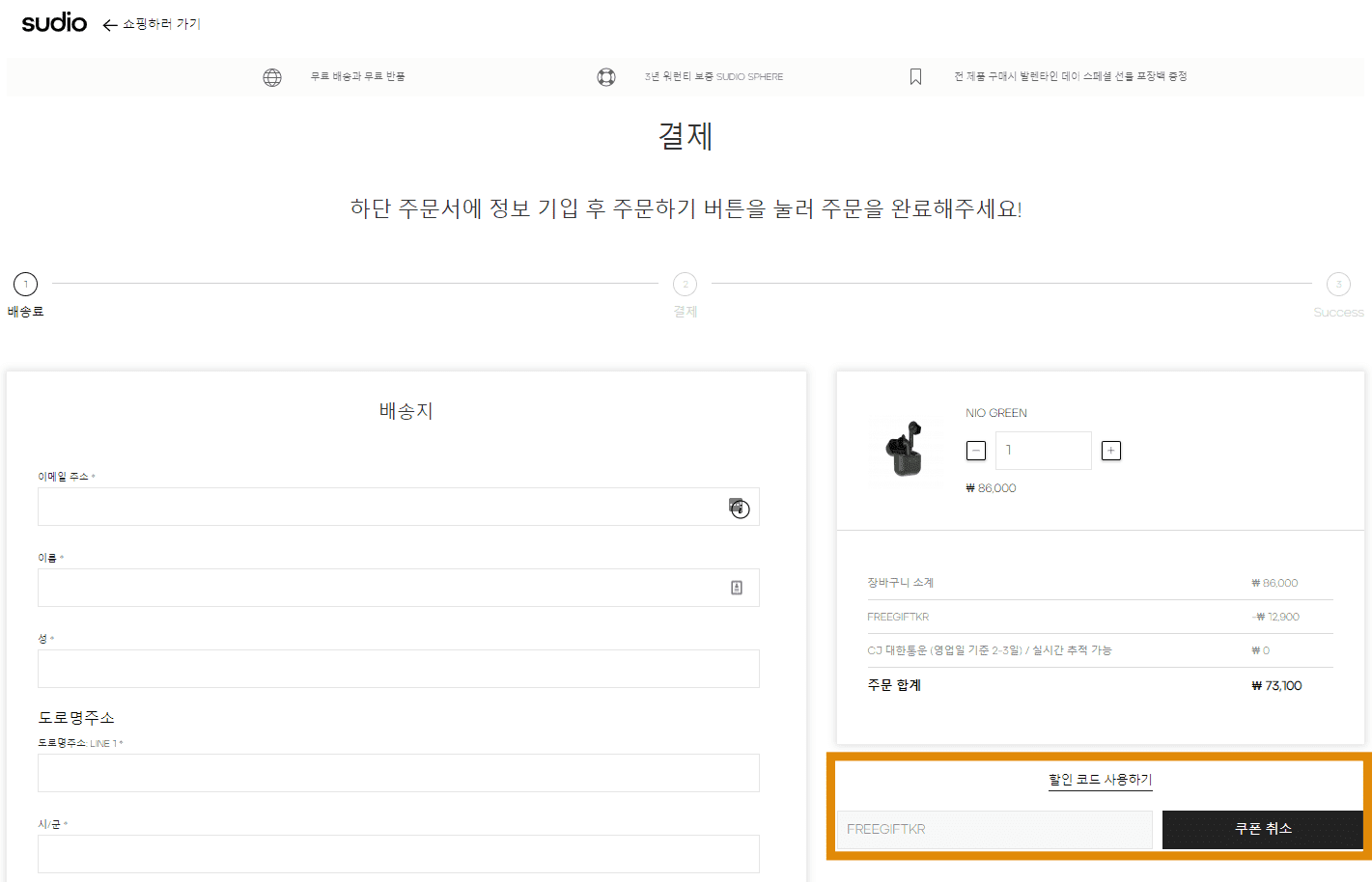 ์ FREEGIFTKR์ด๋ ํ ์ธ ์ฝ๋๋ฅผ ๋ฃ์ผ๋ฉด 15% ํ ์ธ์ ๋ฐ์ 86,000์์ง๋ฆฌ ๋์ค๋ฅผ 15% ํ ์ธ๋ฐ์ 73,100์์ ๊ตฌ์
