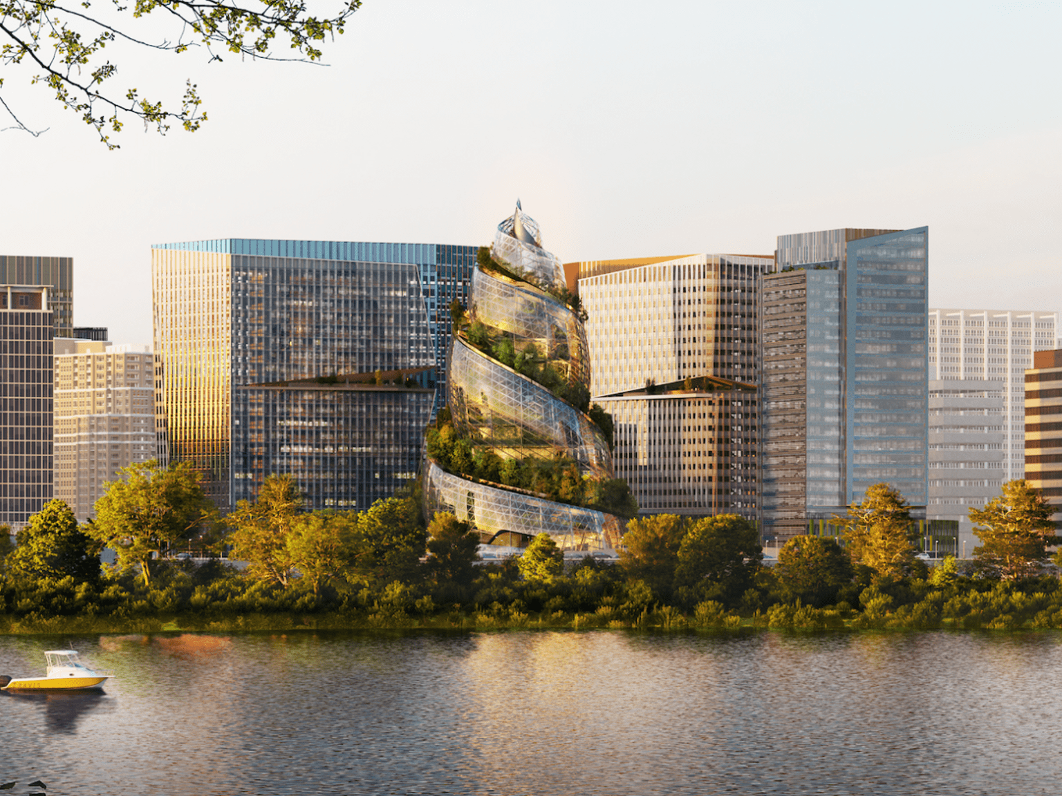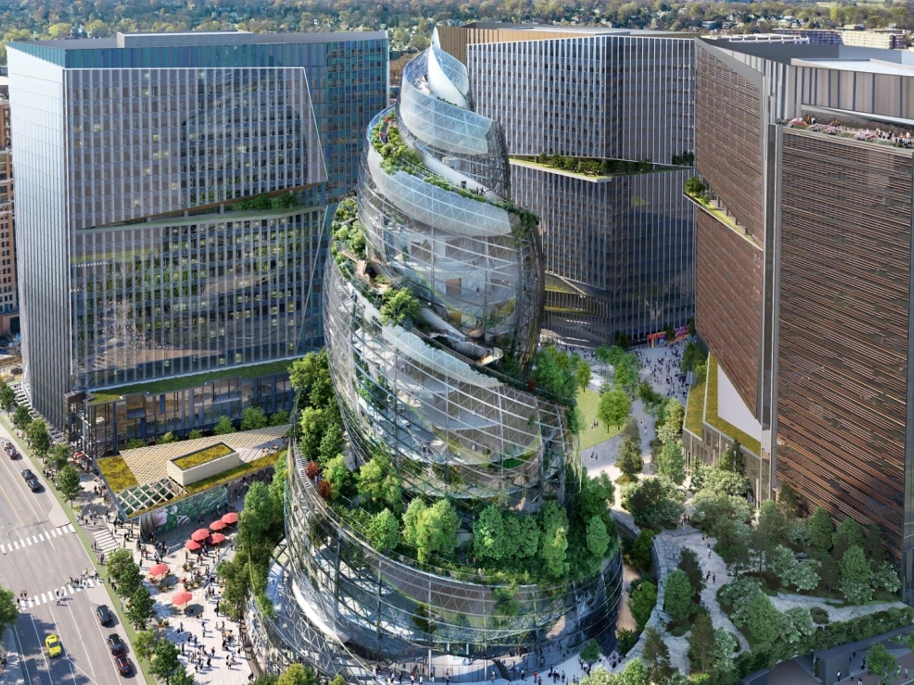 NBBJ has designed a spiralling glass tower covered in trees and walking trails for online retailer Amazon to use as its new headquarters in Virginia.