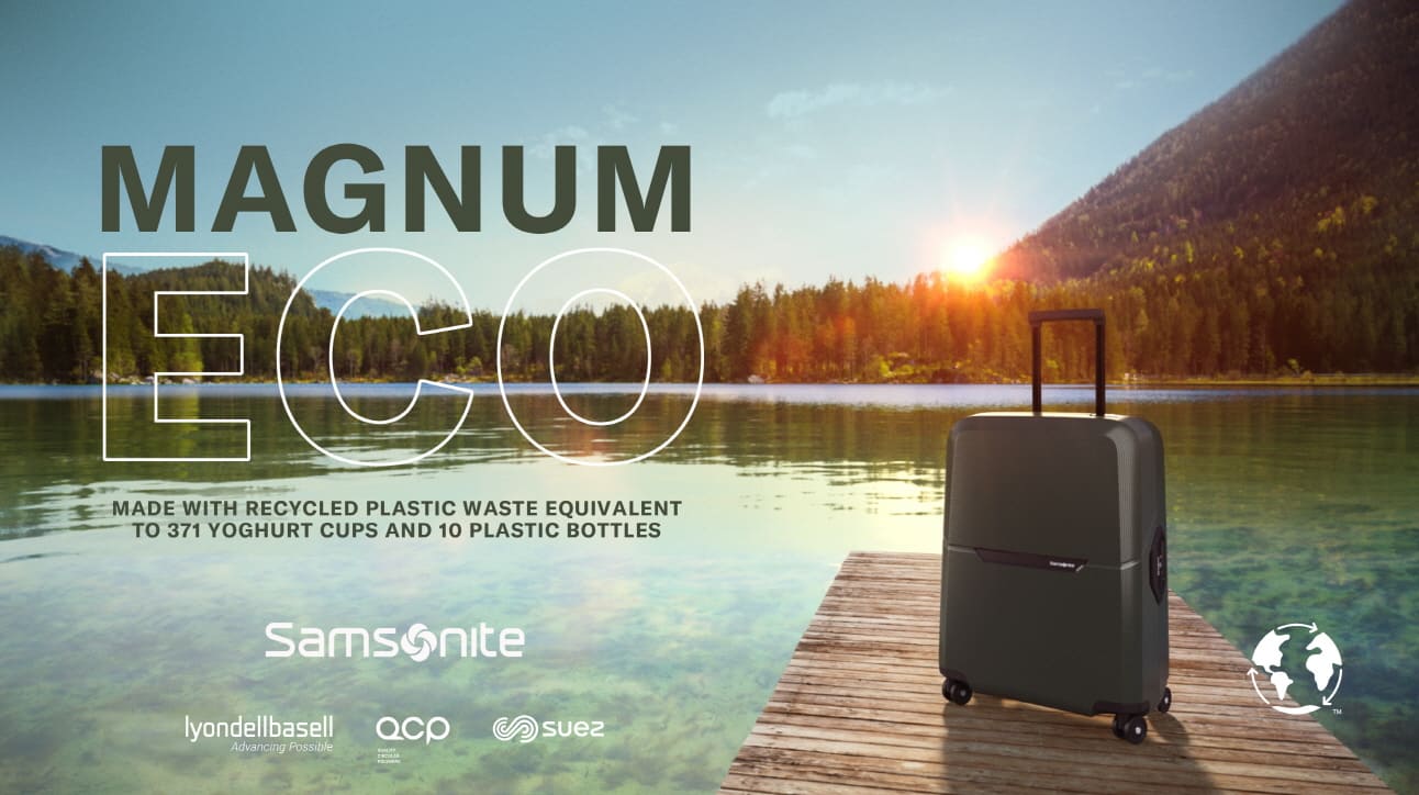 Our Magnum Eco collection is made in Europe and turns post-consumer waste into high-quality luggage. The shells are composed of recycled polypropylene, from yoghurt cups to ice cream containers, and the interior lining is made from recycled PET bottles.