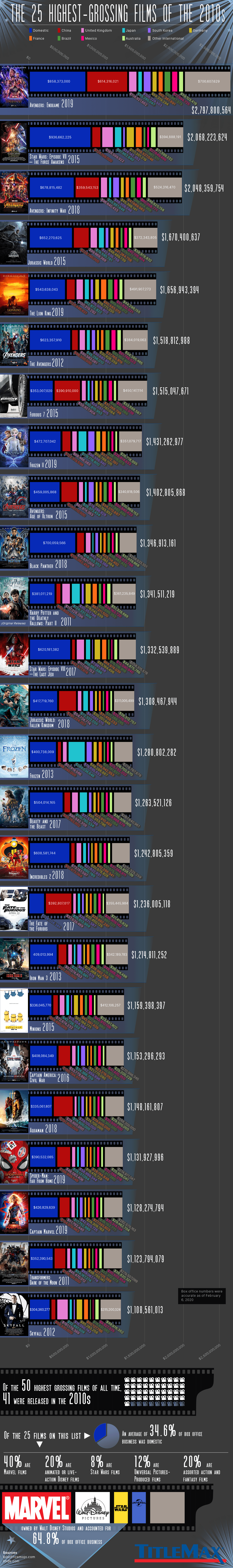 The past decade was an incredibly lucrative time for movies. From box office favorites like Star Wars to the highly successful films of the Marvel Cinematic Universe, many memorable films were produced during the 2010s. This infographic highlights the 25 h