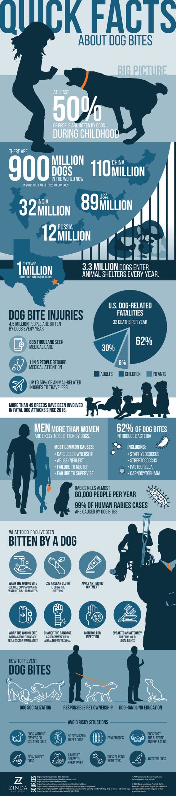 Quick Facts About Dog Bites [Infographic] CALL (888) 979-7521 TO SPEAK WITH A DOG BITE LAWYER FOR FREE Animals don’t interact the same way that humans do, and often their emotions manifest themselves through aggression. Other times dogs are naturally