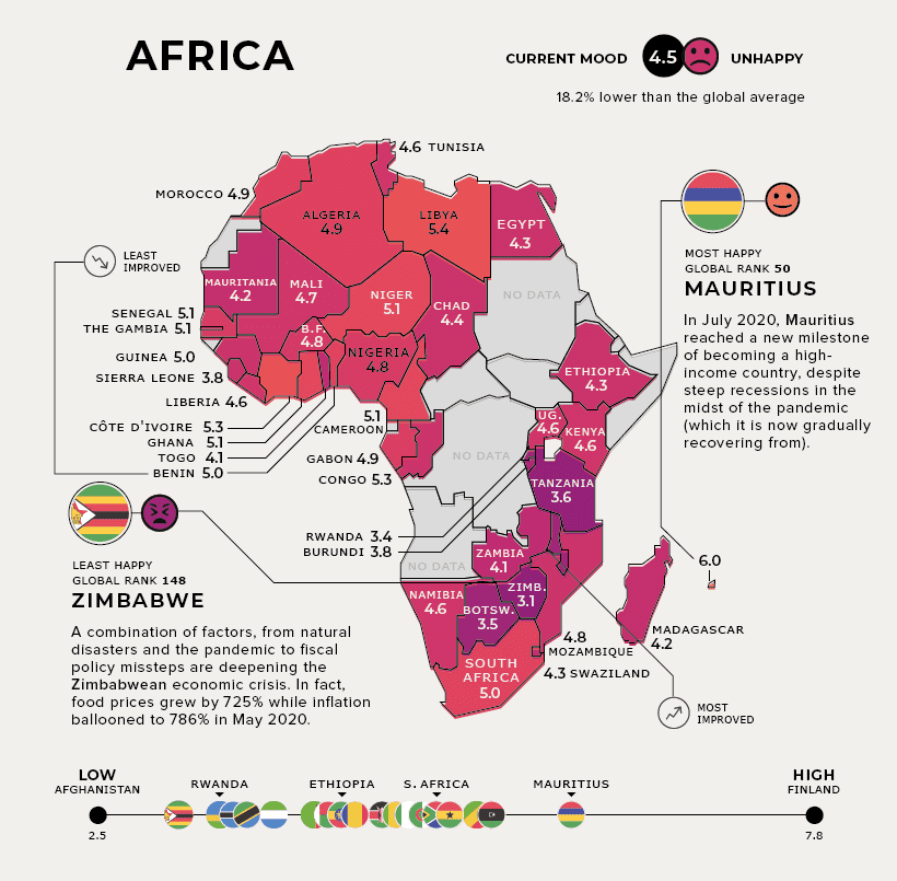 Global happiness levels are determined by many diverse factors. These maps look at the happiest and unhappiest countries in every region.