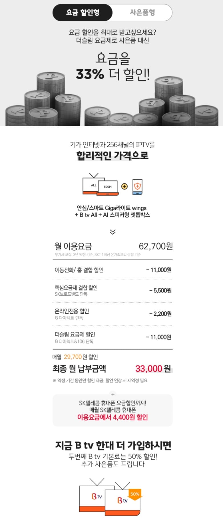 SK๋ธ๋ก๋๋ฐด๋ B๋ค์ด๋ ํธ์ต. ์ธํฐ๋ท ๊ฐ์ ์ ์ต๋ 46๋ง ์ ๋๋ 33% ์๊ธ์ด ํ ์ธ๋๋ ์ธํฐ๋ท์๊ธ์ ์์ธ์?