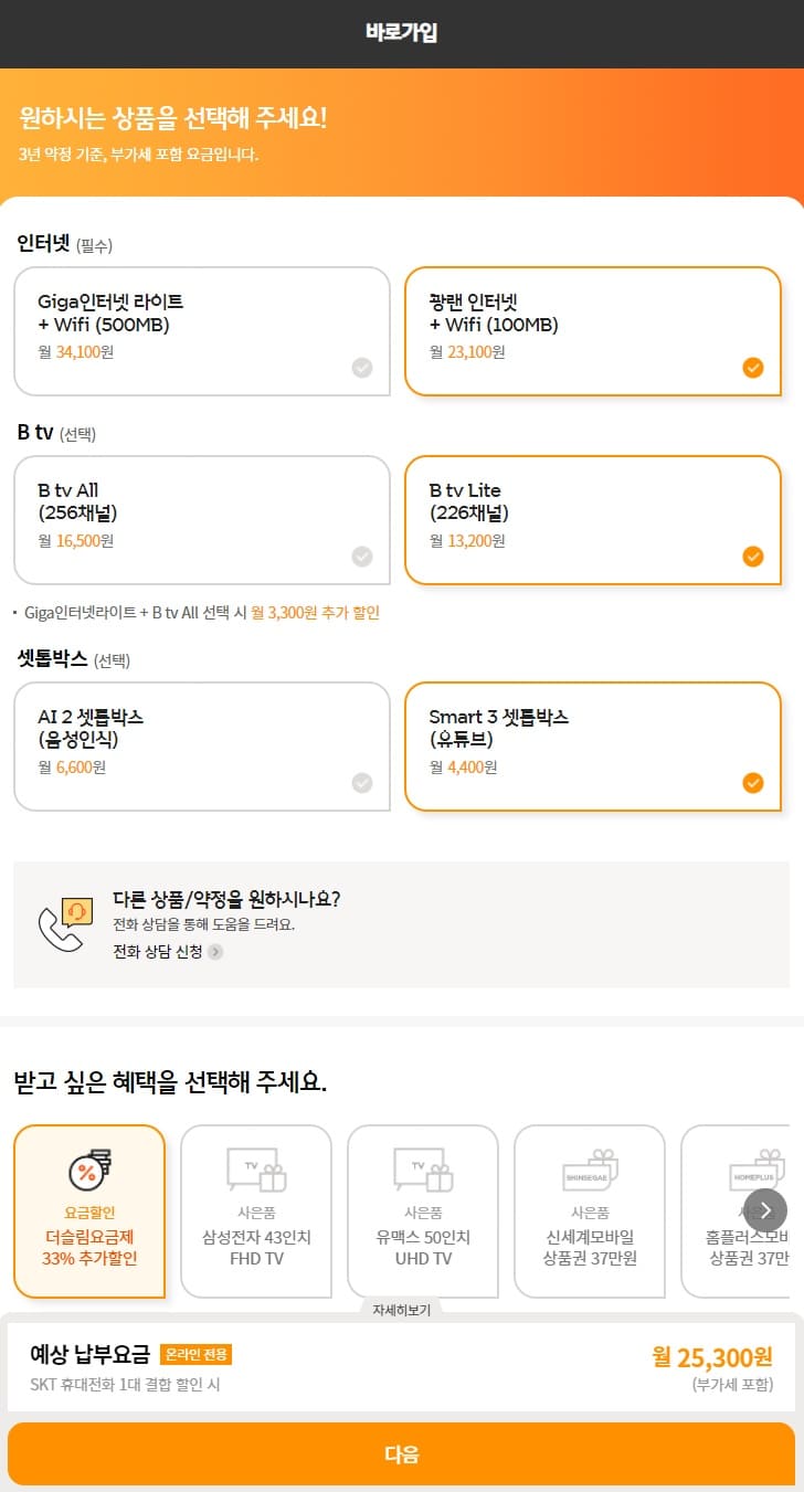 ์ ๊ฐ์ด ์ค์์ ์ถ๊ตฌํ์ ๋ค๋ฉด~ ๊ด๋ ์ธํฐ๋ท+์์ดํ์ด(100MB)์ B tv ๋ผ์ดํธ(226์ฑ๋), ์ ํ๋ธ ์์ฒญ๋ ๊ฐ๋ฅํ ์ค๋งํธ 3 ์