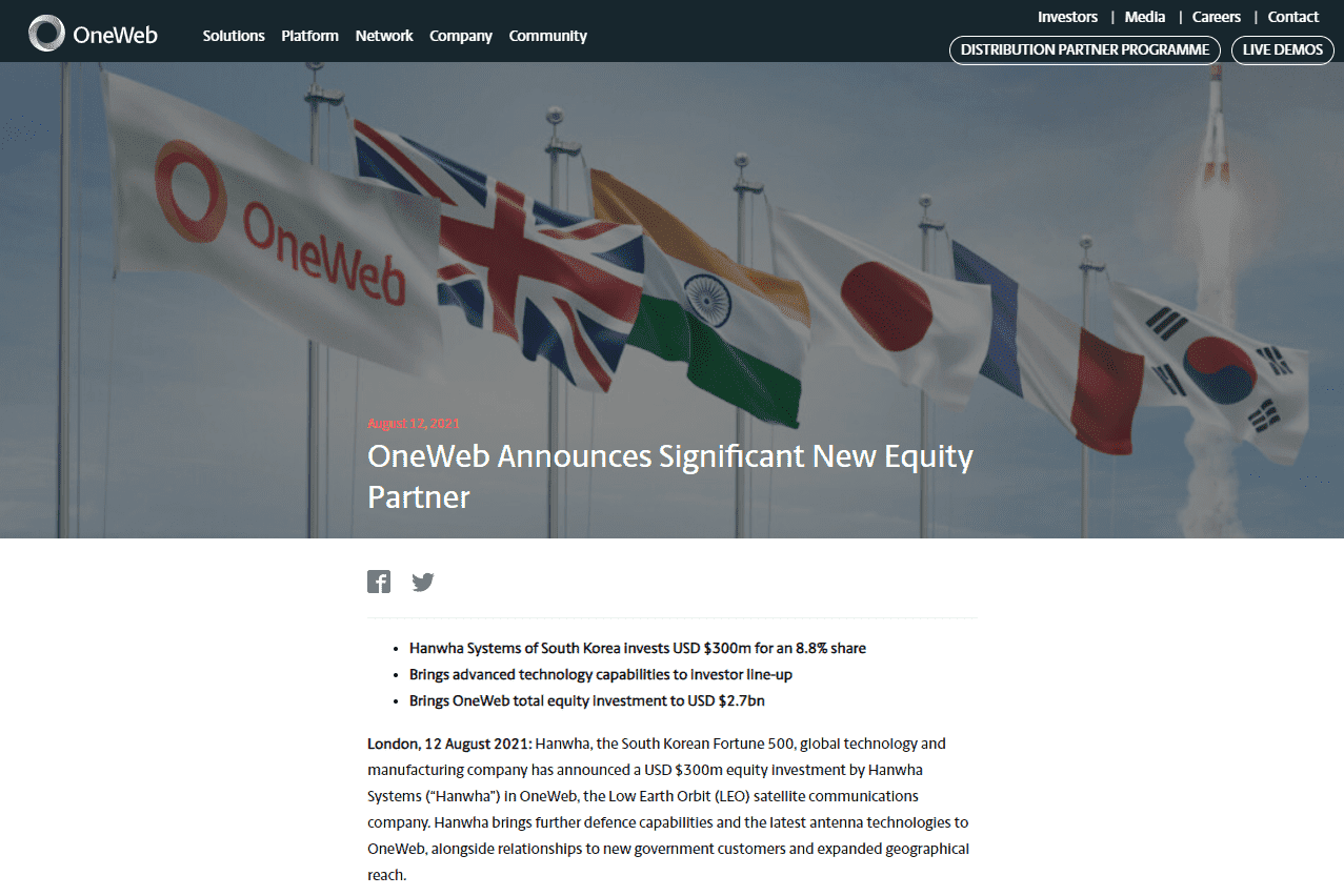 μΈκ³ μ΅μ΄λ‘ μ°μ£Ό μΈν°λ·μ© μμ±μ μμμ¬λ Έλ μκ΅μ μμΉ(OneWeb) μ΄μ¬νμ ννμμ€ν