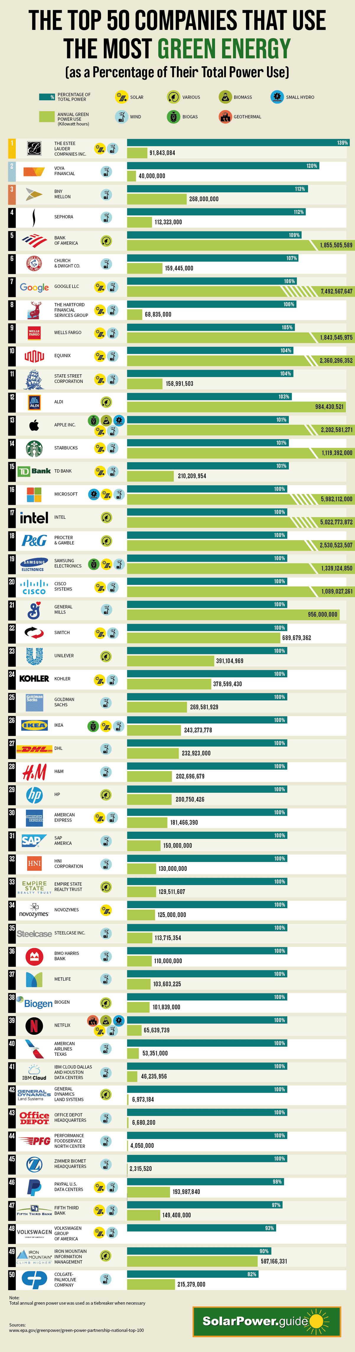 The Top 50 Companies That Use the Most Green Energy (as a Percentage of Their Total Power Use) - SolarPower.Guide - Infographic