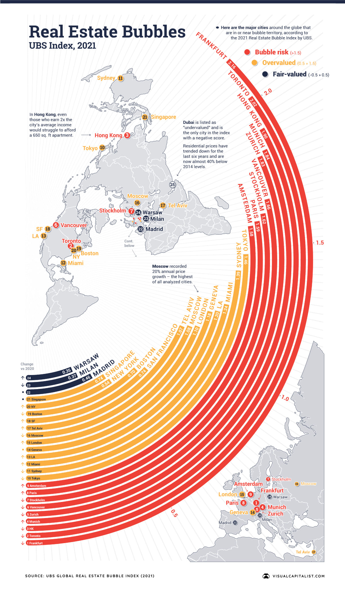 ํ ๋ก ํ , ํ์ฝฉ, ํ๋ฆฌ ๋ฑ ์ธ๊ณ ์ฃผ์ ๋์์ 2021 ๋ถ๋์ฐ ๋ฒ๋ธ ํํฉ... ์ธํฌ๊ทธ๋ํฝ by VISUALCAPITALIST.com...