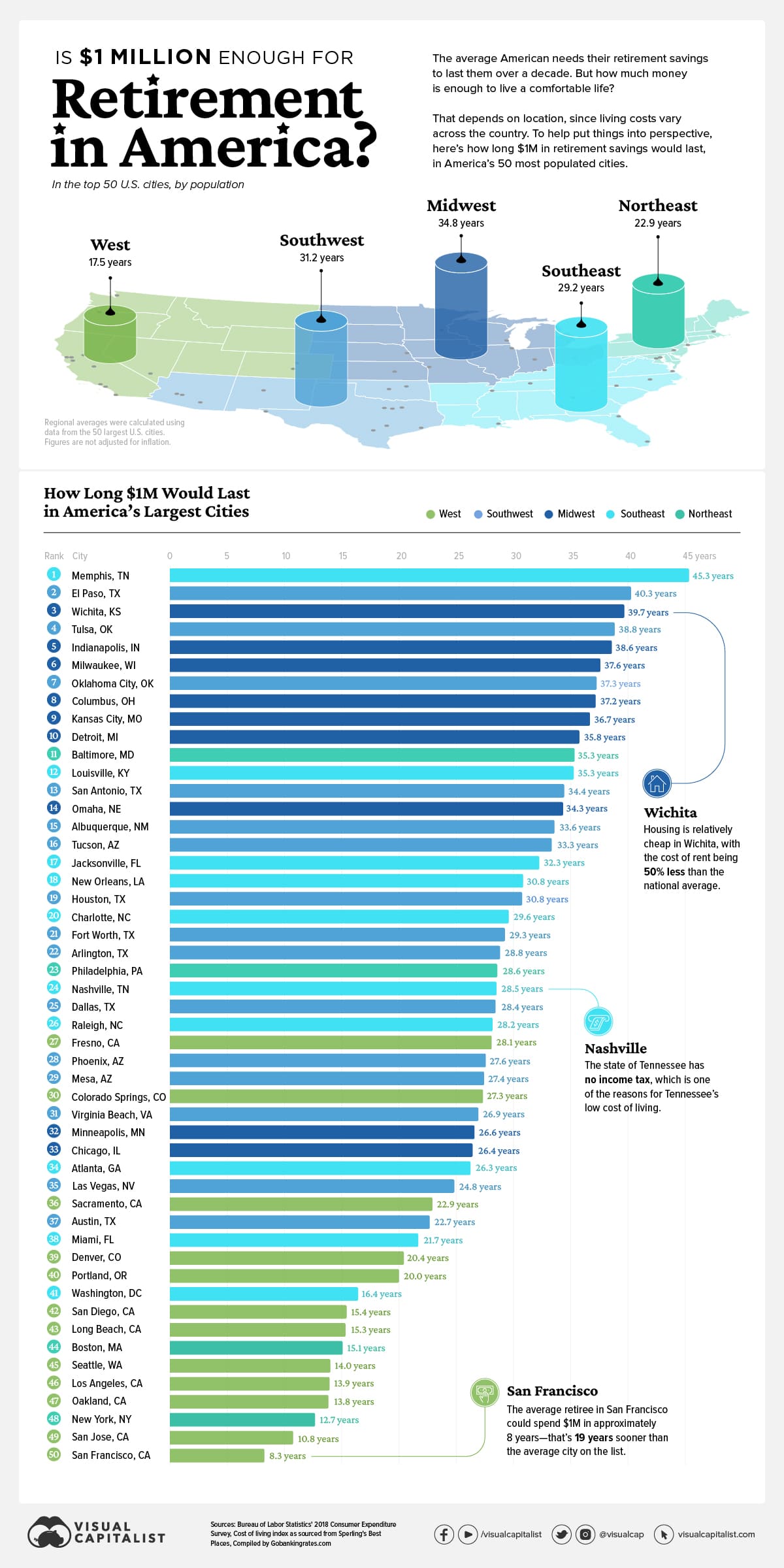 The average American needs their retirement savings to last them over a decade. In which cities is $1 million enough to retire comfortably?