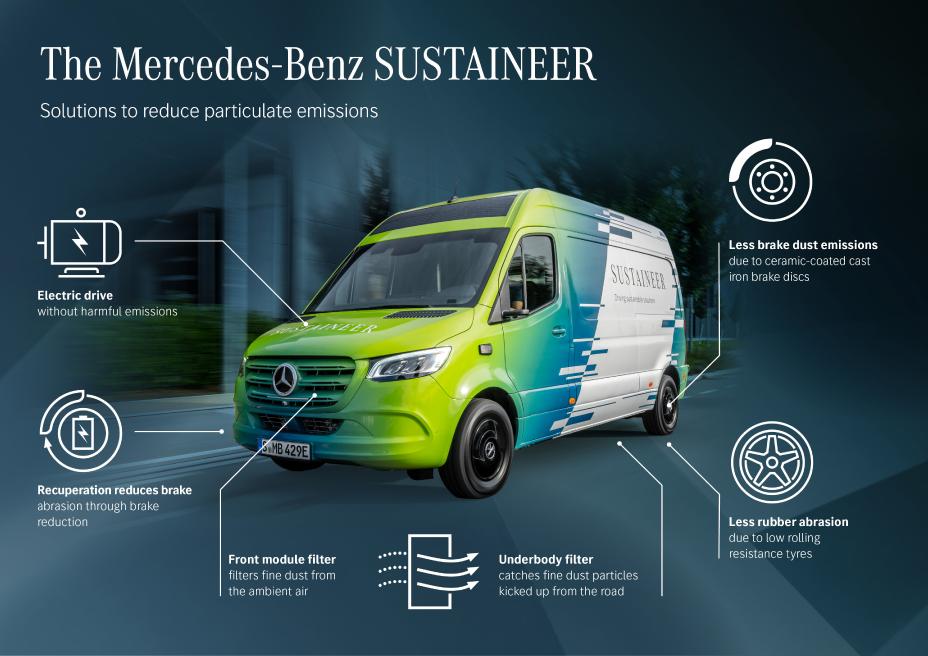 Last-mile vans that are climate neutral, produce their own green electricity and can actively improve the air quality in cities: with its technology demonstrator, the SUSTAINEER (SUSTAINABILITY PIONEER), Mercedes-Benz Vans is providing us with a tangible i