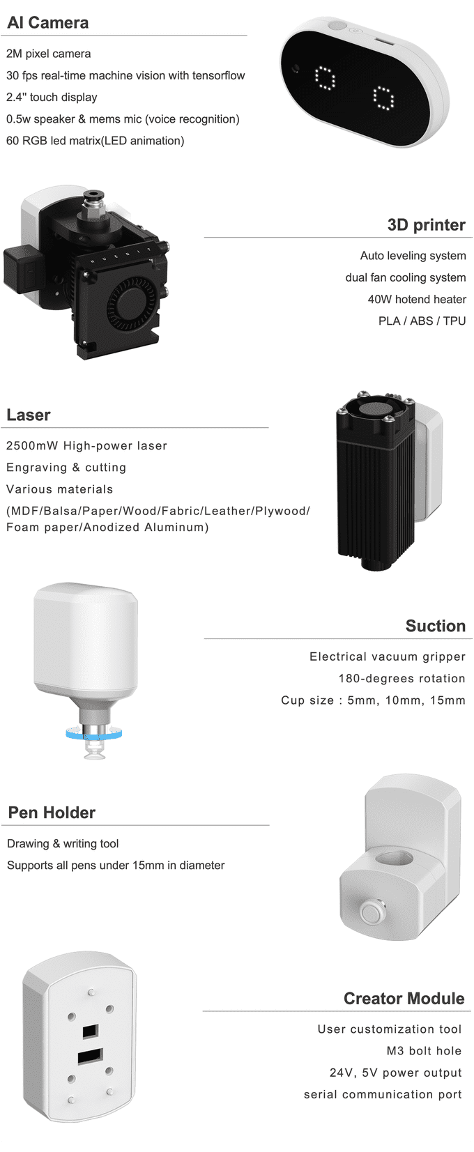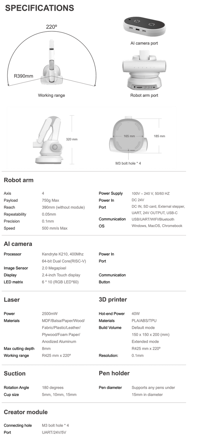 λΆν° λ μ΄μ κ°κ³΅, 그리기, λ€μ΄μ¬λ¦¬κΈ° λ± λ€μν κΈ°λ₯μ μνν μ μκ² λμμΈλμ΄ μλλ°μ. μ΅λ 500mm/sμ μλλ‘ 390mmκΉμ§ λ»μ μ μκ³ 750gκΉμ§ λ€μ΄ μ¬λ¦΄ μ μλ λ‘λ΄ νμΈ ν΄λμ μ¬λμ΄λ μ¬λ¬Όμ μΈμν μ μλ AI μΉ΄λ©λΌ, λ μ΄μ , ν νλ, μμ