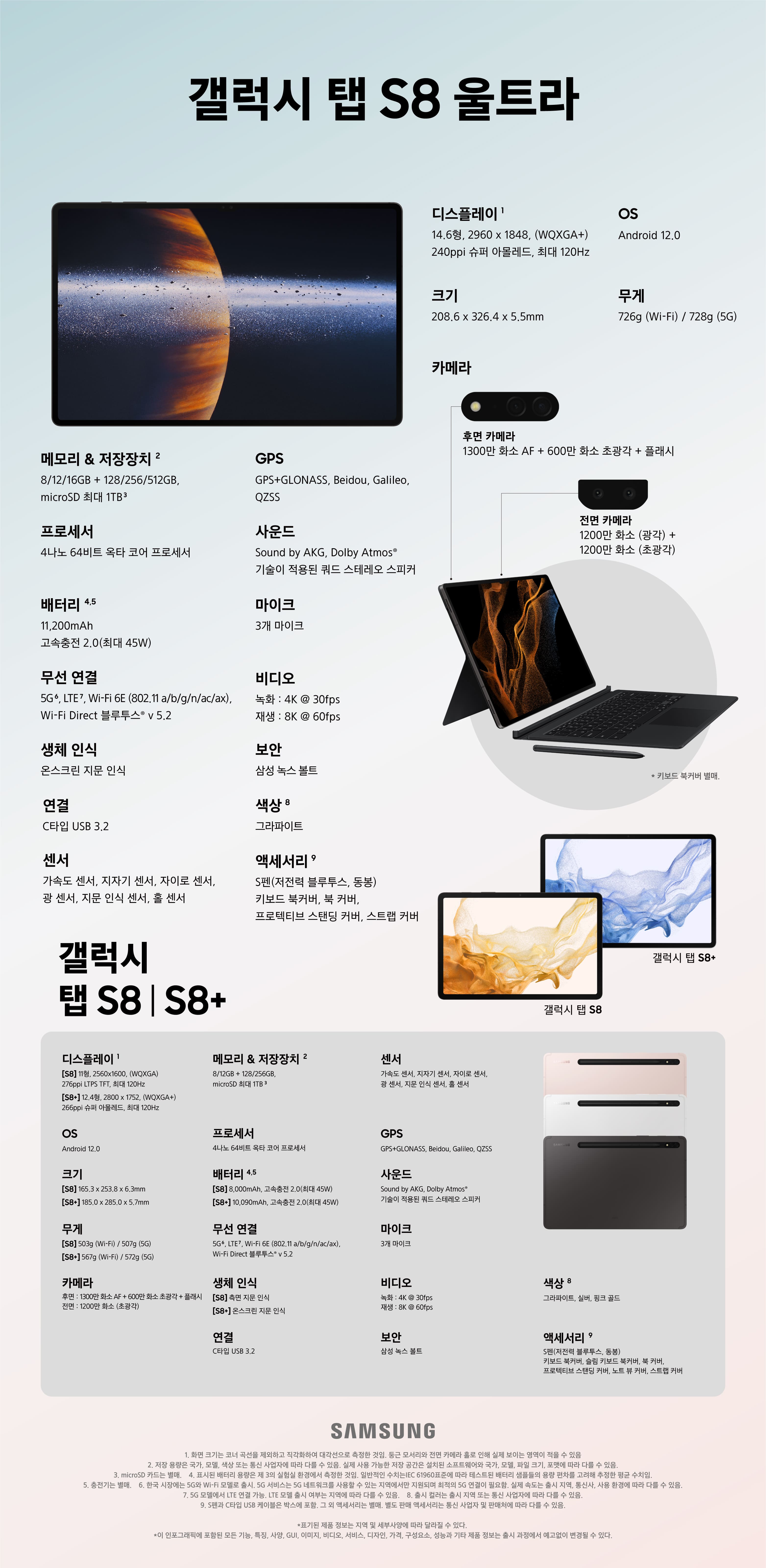 ๋จผ์ ๊ฐค๋ญ์ ํญ S8(Galaxy Tab S8)์ ์ต๋ 120Hz๋ฅผ ์ง์ํ๋ 11์ธ์น(2560 x 1600) LCD ํฐ์น ์คํฌ๋ฆฐ, 4nm ํ๋ก์ธ์ , 8GB/12GB ๋จ, 128/256GB ์ ์ฅ ์ฅ์น(๋ง์ดํฌ๋ก SD), ์ ๋ฉด 1,200๋ง(์ด๊ด๊ฐ) ํ์/ํ๋ฉด 1300๋ง+600๋ง(์ด๊ด๊ฐ) ํ์ ๋์ผ ์นด๋ฉ๋ผ, 8,000mAh ๋ฐฐํฐ๋ฆฌ(45W ๊ธ์ ์ถฉ์ ) ๋ฑ์ ์ฌ์์ด๊ณ ๊ฐค๋ญ์ ํญ S8 ํ๋ฌ์ค(Galaxy Tab S8+)๋ ์ฌ๊ธฐ์ ํ๋ฉด์ด ์ต๋ 120Hz๋ฅผ ์ง์ํ๋ 12.4์ธ์น(2800 x 1752) ์ํผ AMOLED๋ก ๋ฐ๋๊ณ ๋ฐฐํฐ๋ฆฌ๋ 10,090mAh๋ก ์ฉ๋์ด ๋์ด๋ฌ๋ค๋ ๊ฒ ์ ๋๋ง ์ฐจ์ด๋ฅผ ๋ณด์