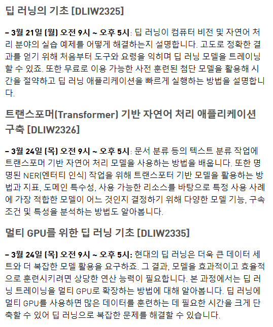 NVIDIAκ° 3μ 21μΌλΆν° 24μΌκΉμ§ GTC DLI(Deep Learing Institute) μ λ¬Έκ° μ§κ° μν¬μμ μ¨λΌμΈμΌλ‘ μ§νν©λλ€! μ΄λ² GTC κΈ°κ° λμ 곡μΈλ μ λ¬Έκ°κ° μ£Όλνλ νΈμ¦μ¨ κ΅μ‘μ ν΅ν΄ κ΄λ ¨ κΈ°μ μ ν₯μμν¬ μ