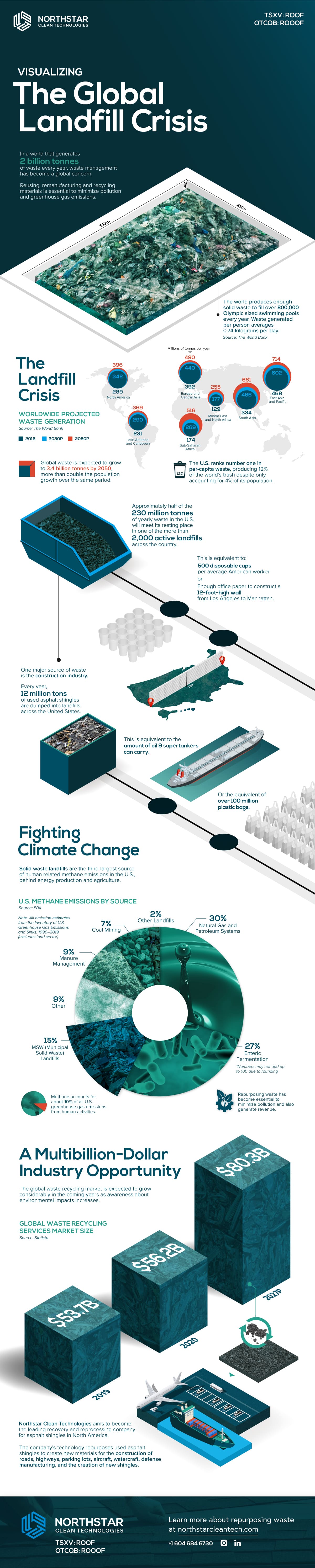 Every year, 12 million tons of used asphalt shingles are dumped into landfills across North America. This graphic by Northstar Clean Technologies shows how recovering this material has become a multi-billion-dollar industry opportunity.