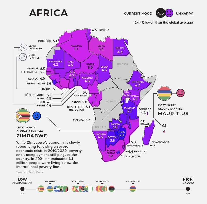 Global happiness levels are determined by several different factors. Here's a look at the happiest and unhappiest countries in every region.