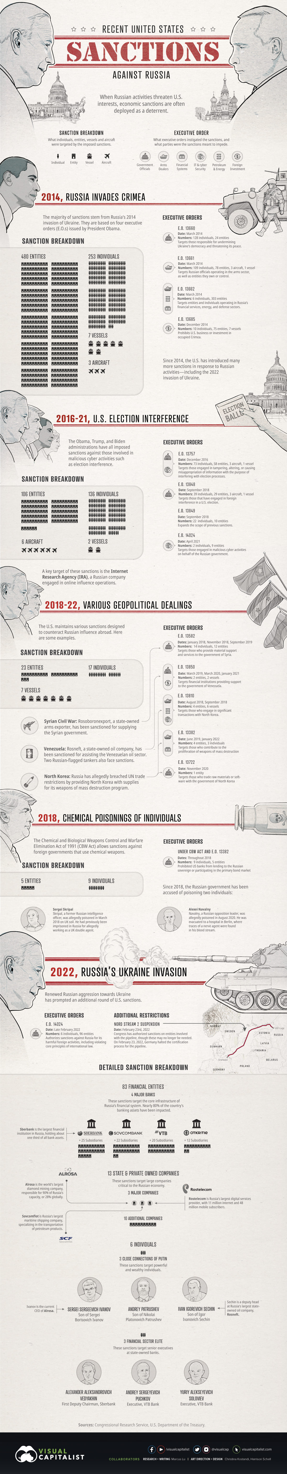 Russia faces a multitude of U.S. sanctions for its participation in global conflicts. This infographic lists who and what has been impacted.