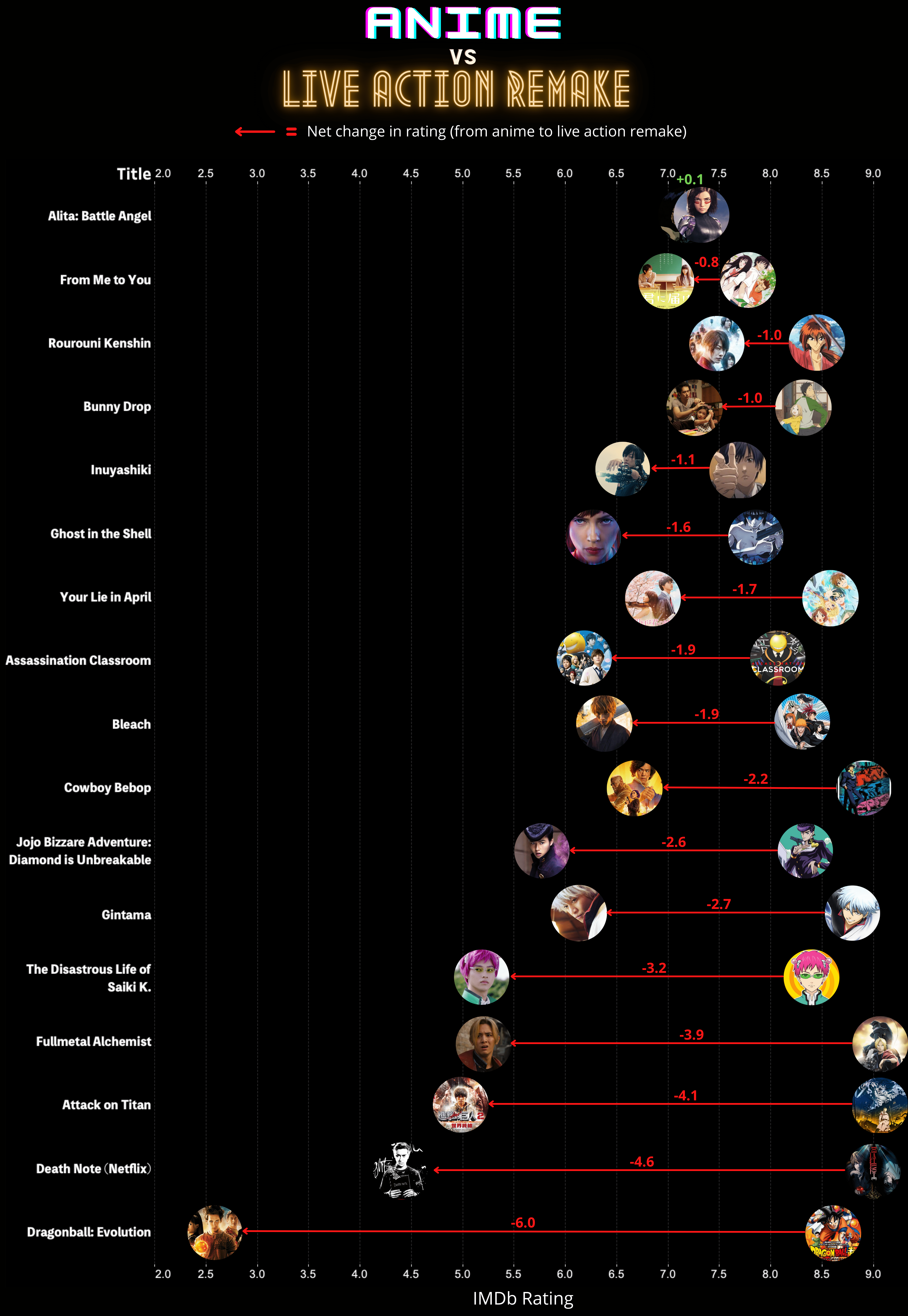 I can say with confidence that remakes rarely beat the original whether it’s movies, books or anime. The chart above breaks down the net change in IMDb rating for anime that became a live action remake, and if you’re an anime fan you’re going to want