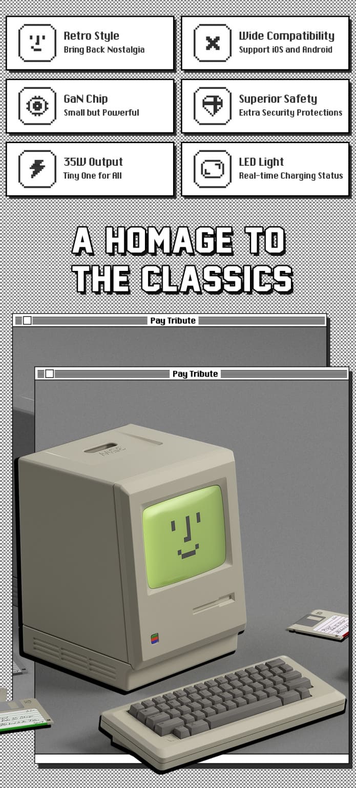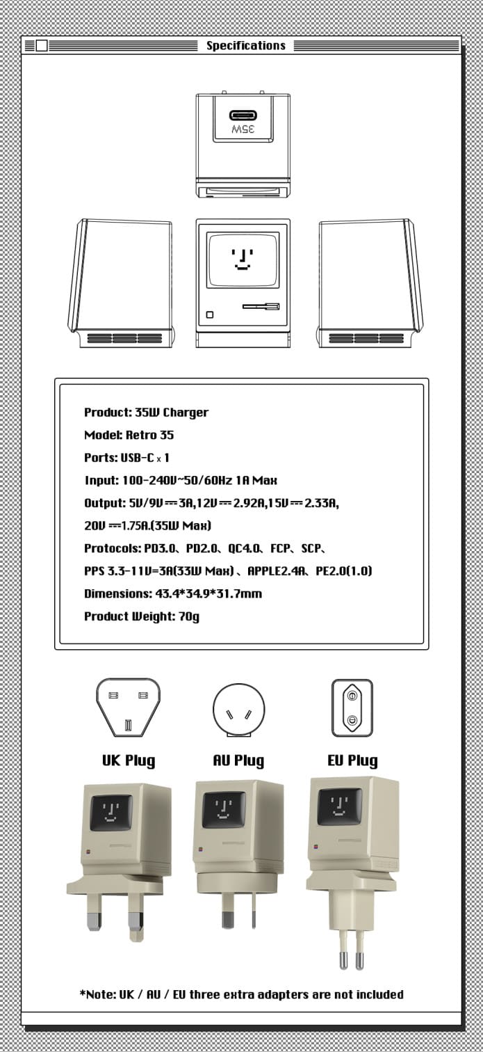 A homage to the classics |MAX 35W output| Charge notebook at high speed | Check out 'SHARGEEK Retro 35 GaN Charger' on Indiegogo.